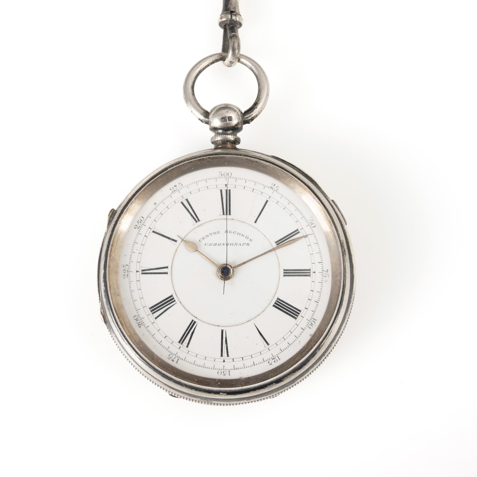 Lépine case with smooth back cover and empty coat of arms reserve, coin edge and lateral slider for stopwatch function. On a hallmarked silver watch chain with long links, lobster clasp and spring ring. Slight signs of age and wear, scratches.