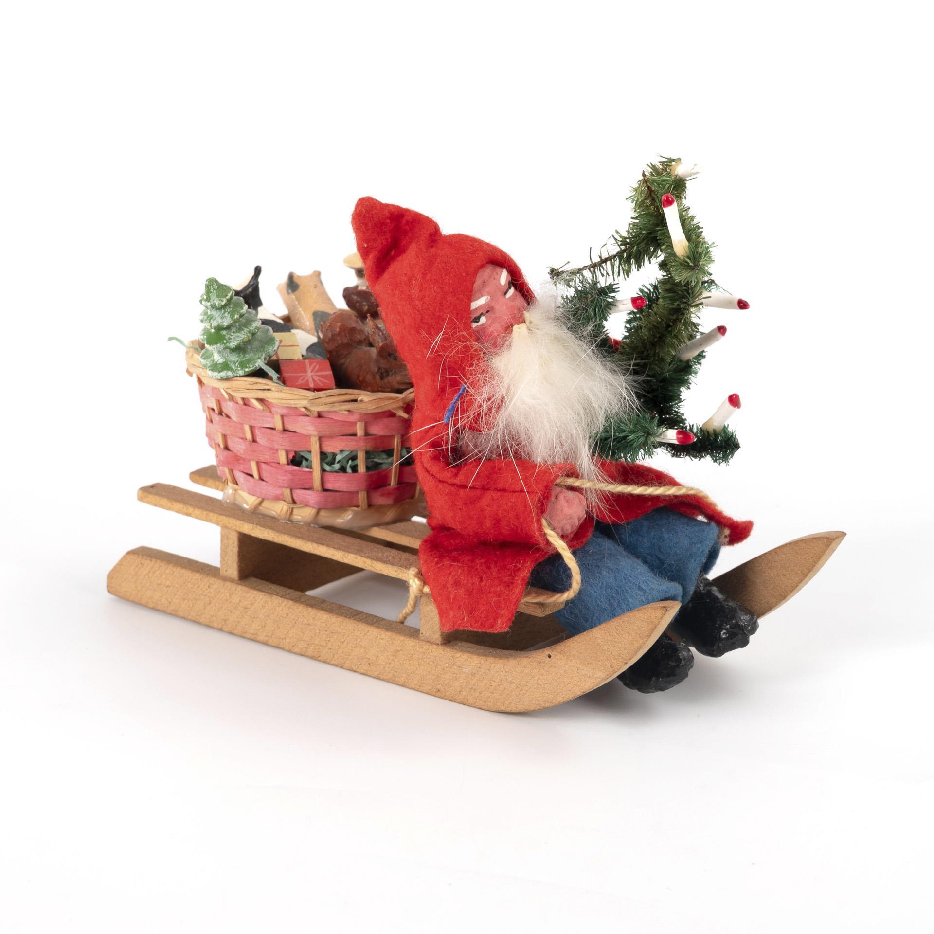 Mass figure in felt clothing, with Christmas tree and basket with toys. 1 candle minimally chipped.