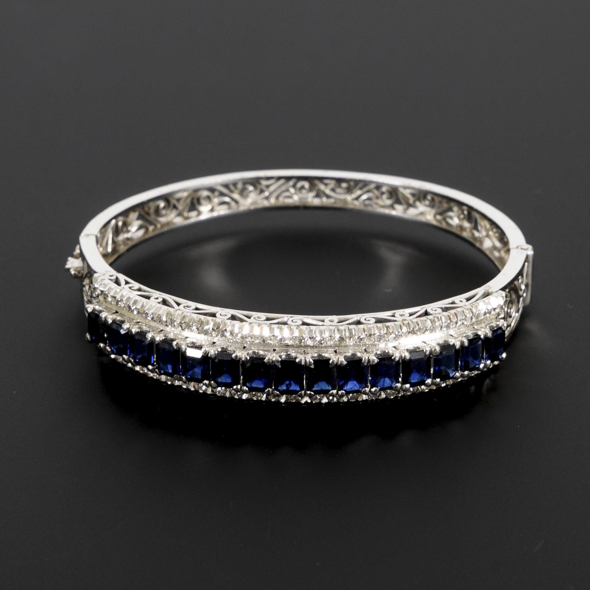Bracelet with richly detailed open work, set with 15 dark blue stones in emerald cut, probably sapphires, and 56 octagonal diamonds. The box lock with simple figure-of-eight safety catch. Safety chain missing.