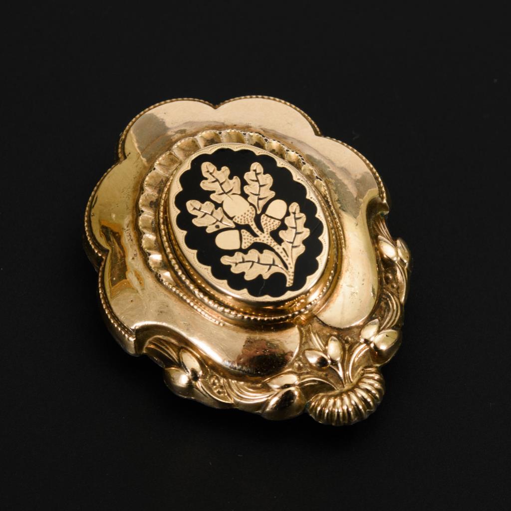 In Hohlform reliefierte Brosche mit Eichenlaubdekor und Schwarzemail. Hakenverschluss.