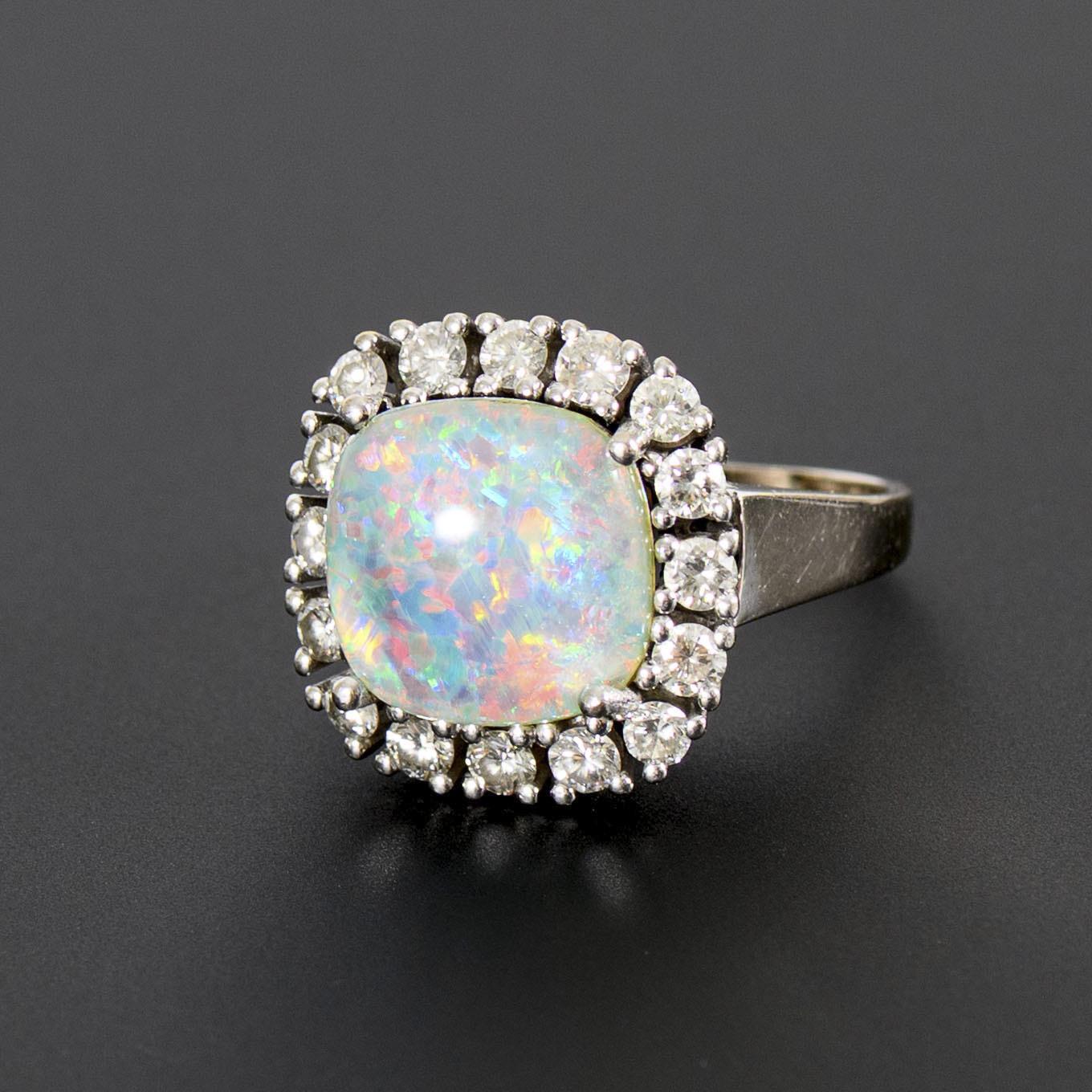 Ring with opal triplet as equilateral cabochon, surrounded by an entourage of 16 chaton-set brilliant-cut diamonds. Trace of an earlier ring shank reduction on the underside.