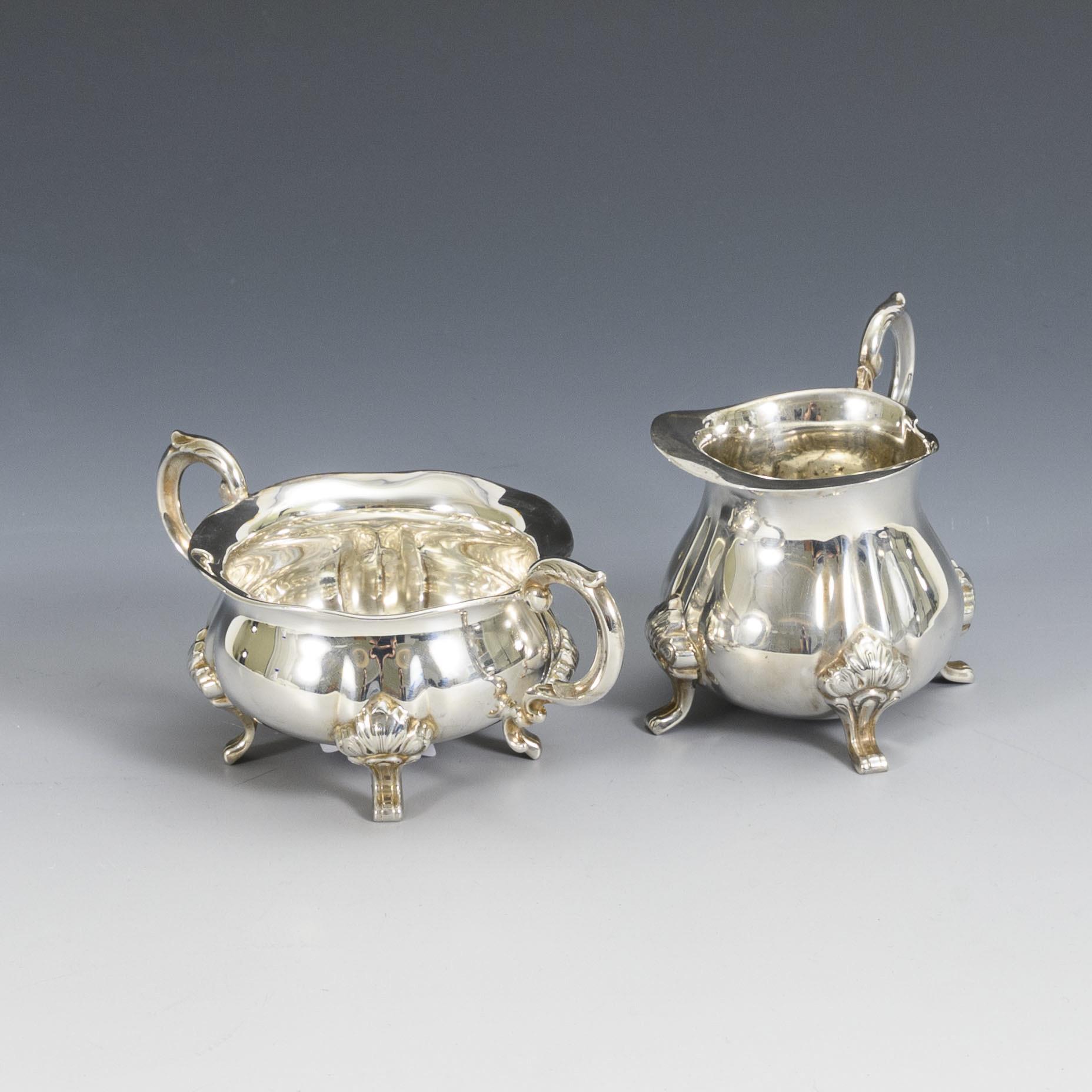 Cream jug and two-handled sugar bowl in neo-baroque design, each on 4 feet. Minimal signs of age and use.