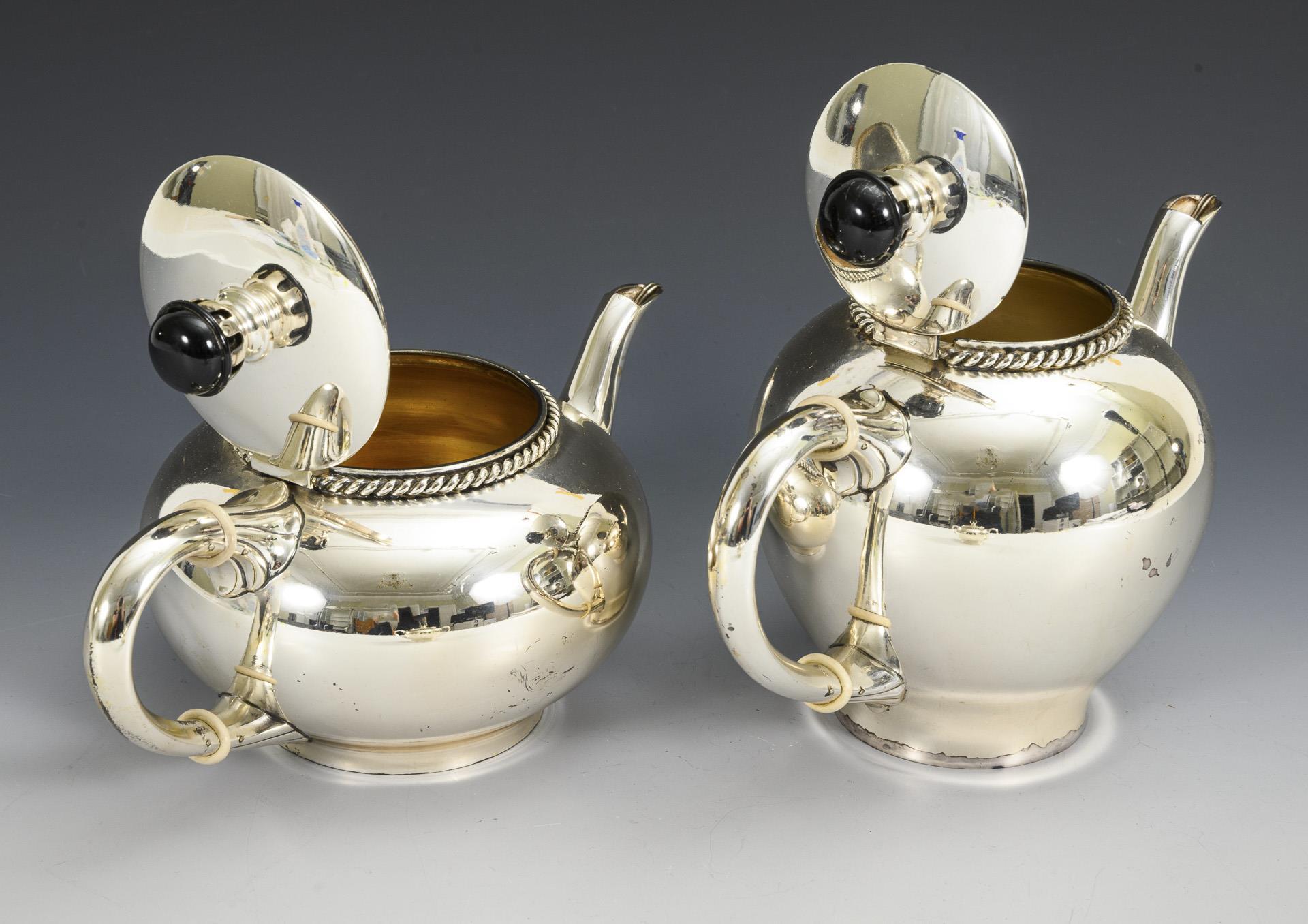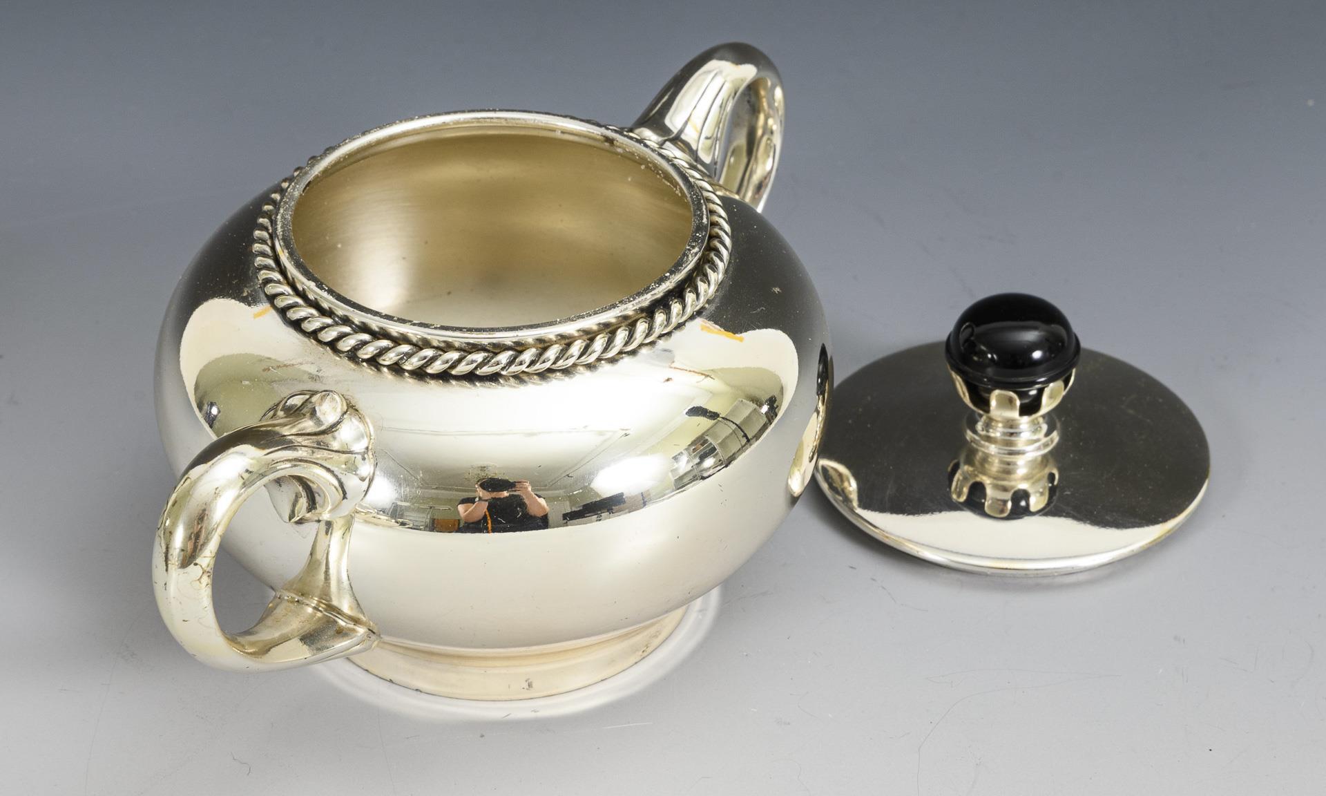Coffee pot (H 17.5 cm), teapot (H 13.5 cm), sugar bowl with 2 handles (H 10.5 cm). Each with a smooth bulbous body with cord rim and flat lid with black bakelite knob. Slight signs of age, some scratches and dents.