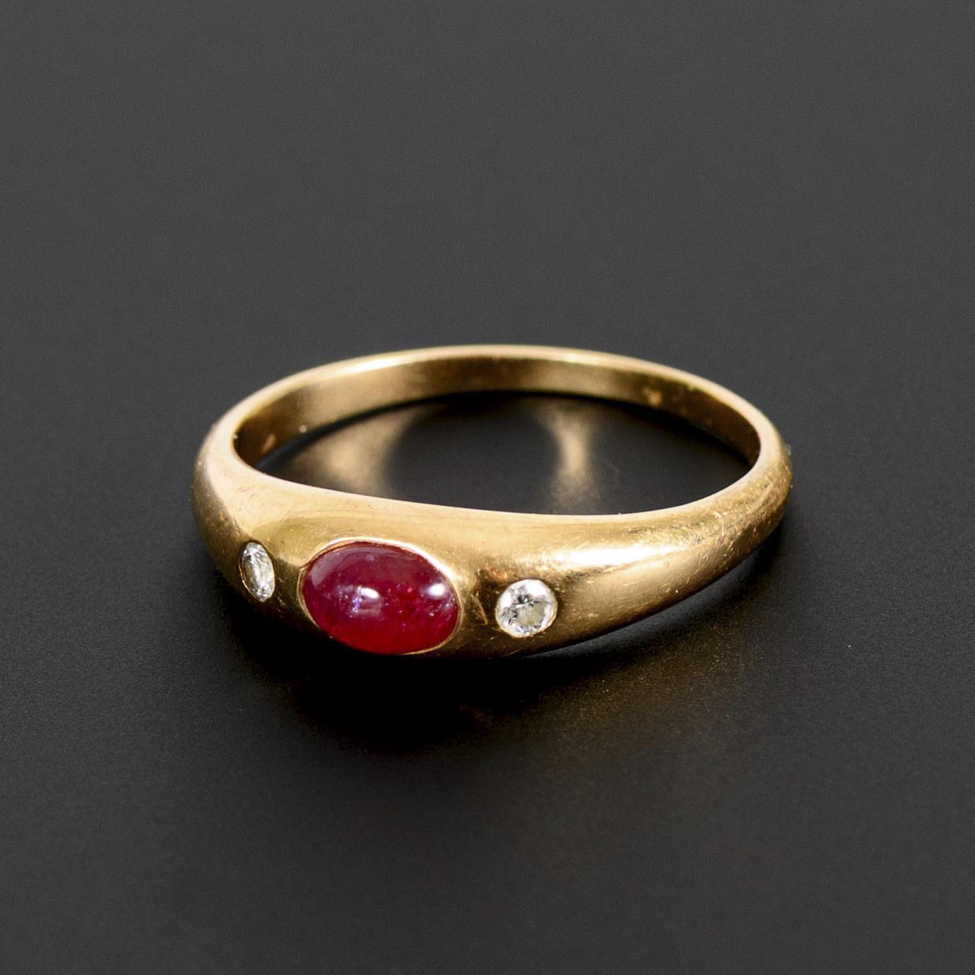 Alliance ring with red colored stone cabochon, probably ruby, flanked by 2 brilliant-cut diamonds, in a classic, narrow ring band. Signs of wear.