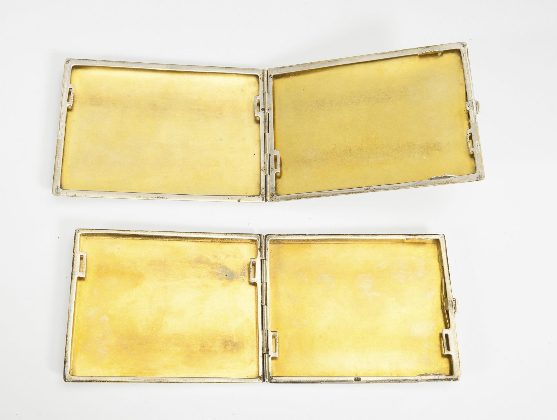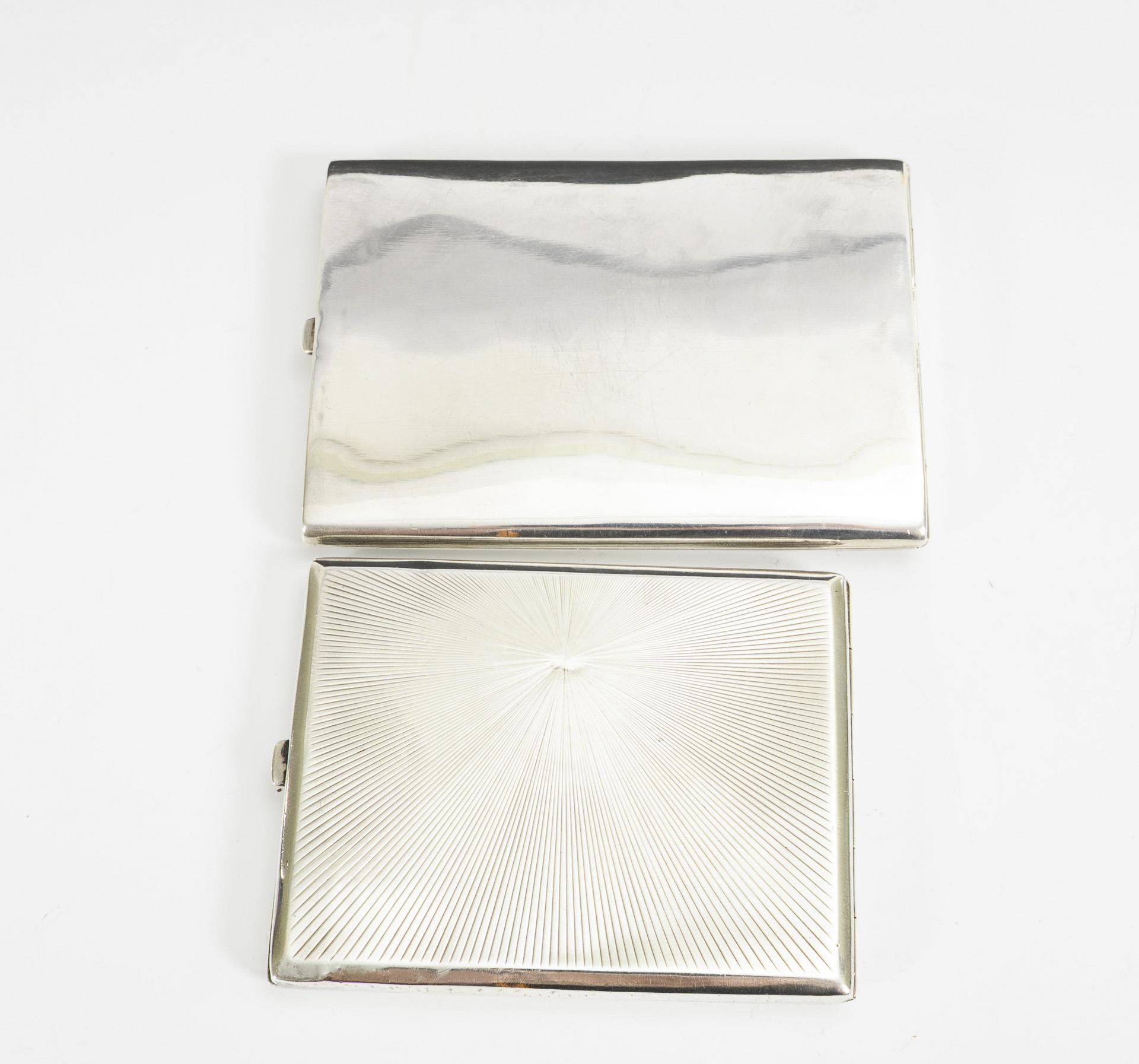 2 silver cigarette boxes with blue enamel edge.