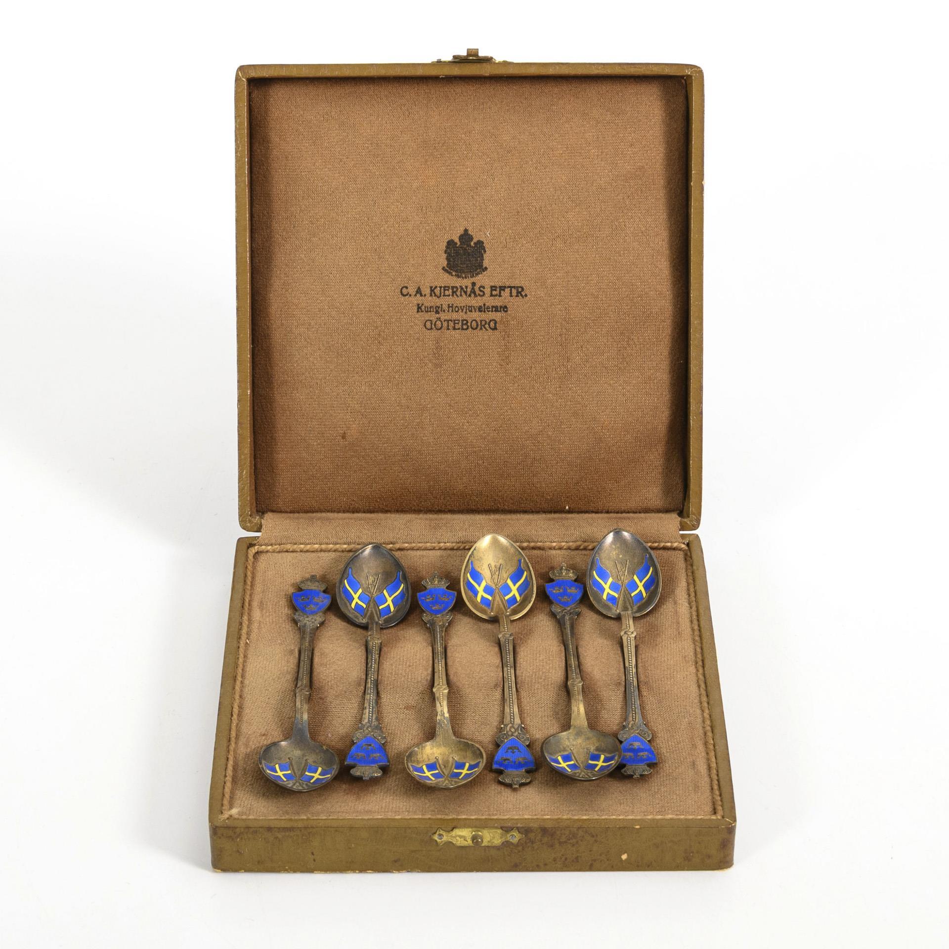 6 Swedish silver spoons in brown case. Jeweler C.A. Kjernas Eftr., Gothenburg.