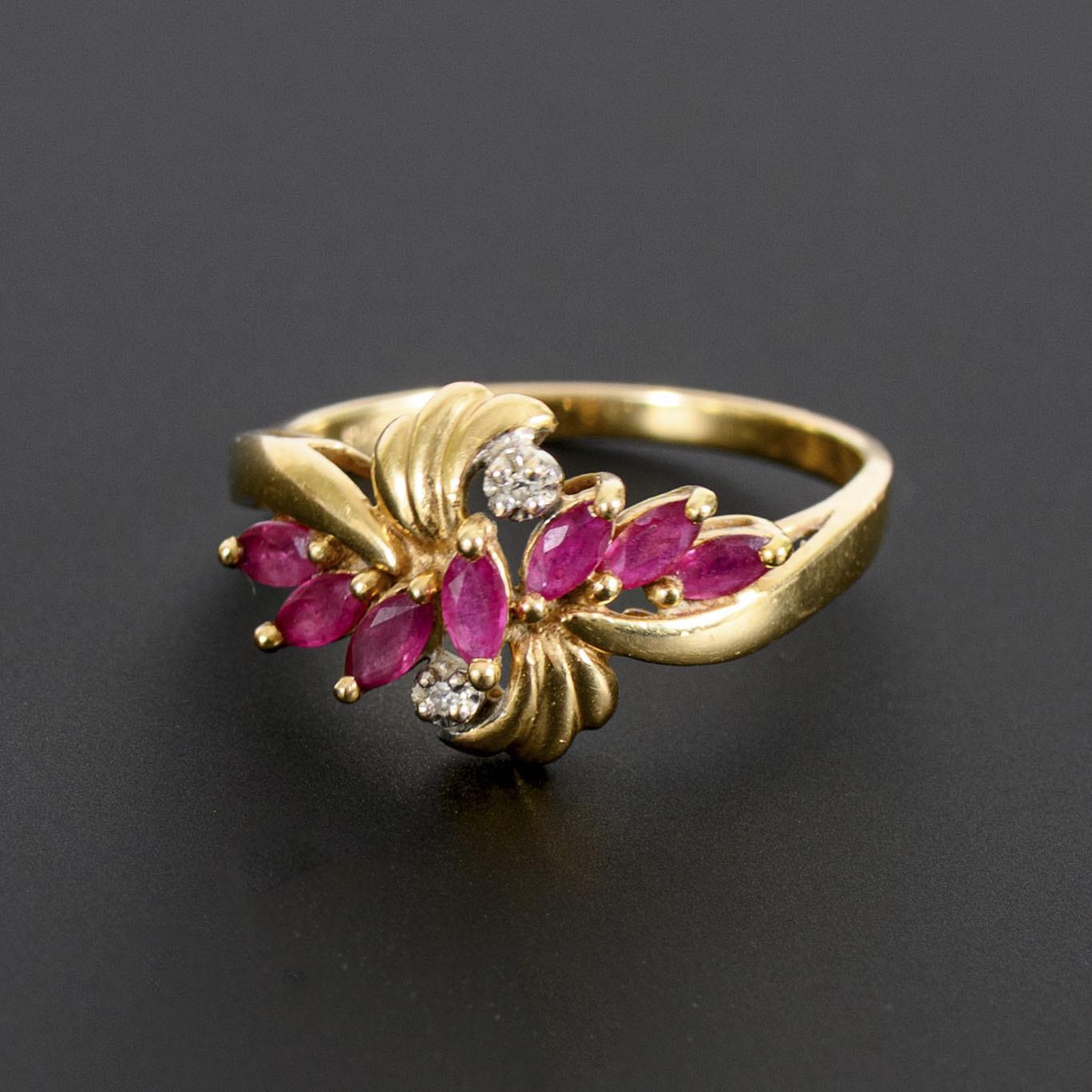 Ring with red colored stone navettes, probably rubies, and small diamonds.