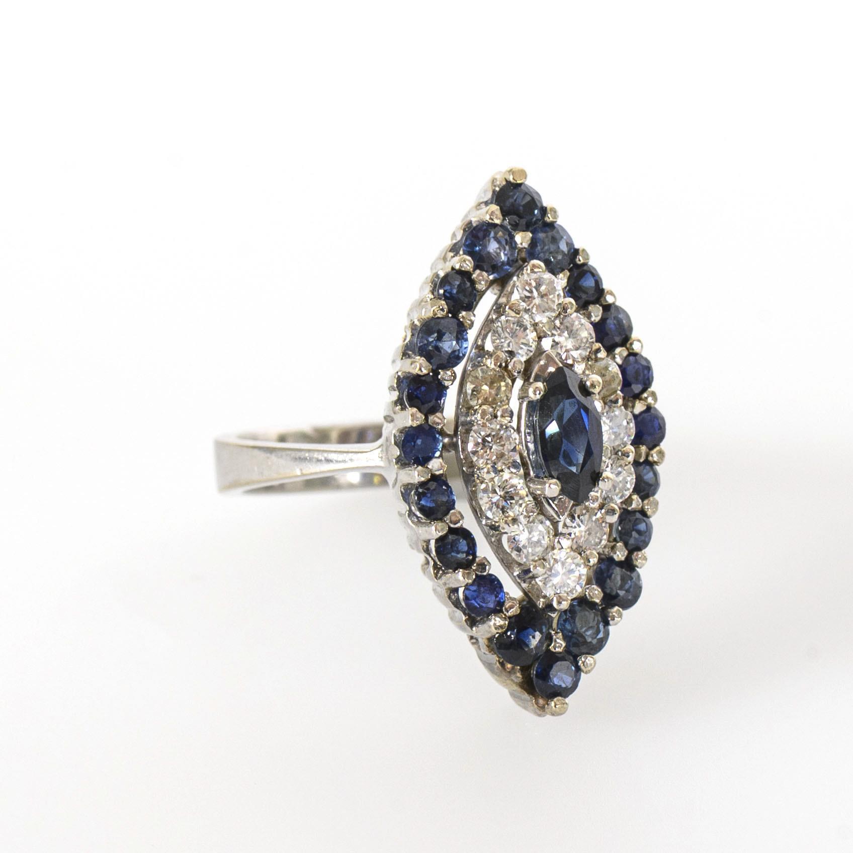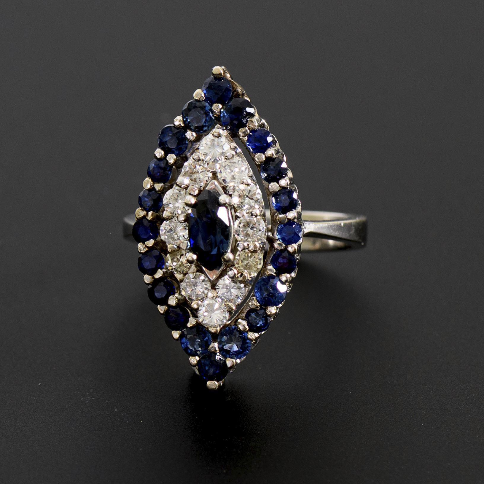 Exceptionally large navette ring with brilliant-cut diamonds and blue colored stones, probably sapphires.