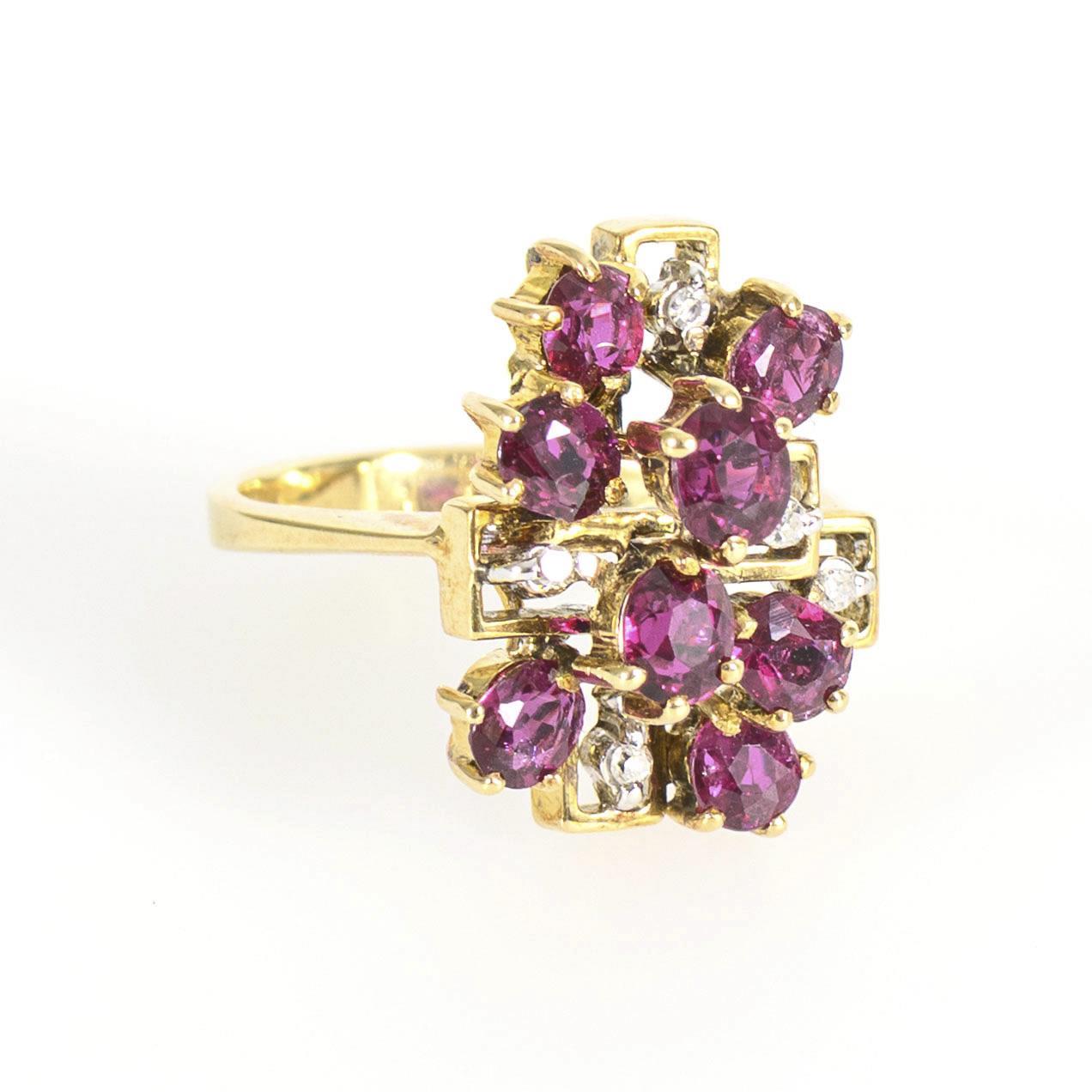 Architectural ring head with raised structure, set with 8 red, slightly oval-faceted colored stones, probably rubies, and 5 small diamonds set in white gold, between a narrow ring shank.