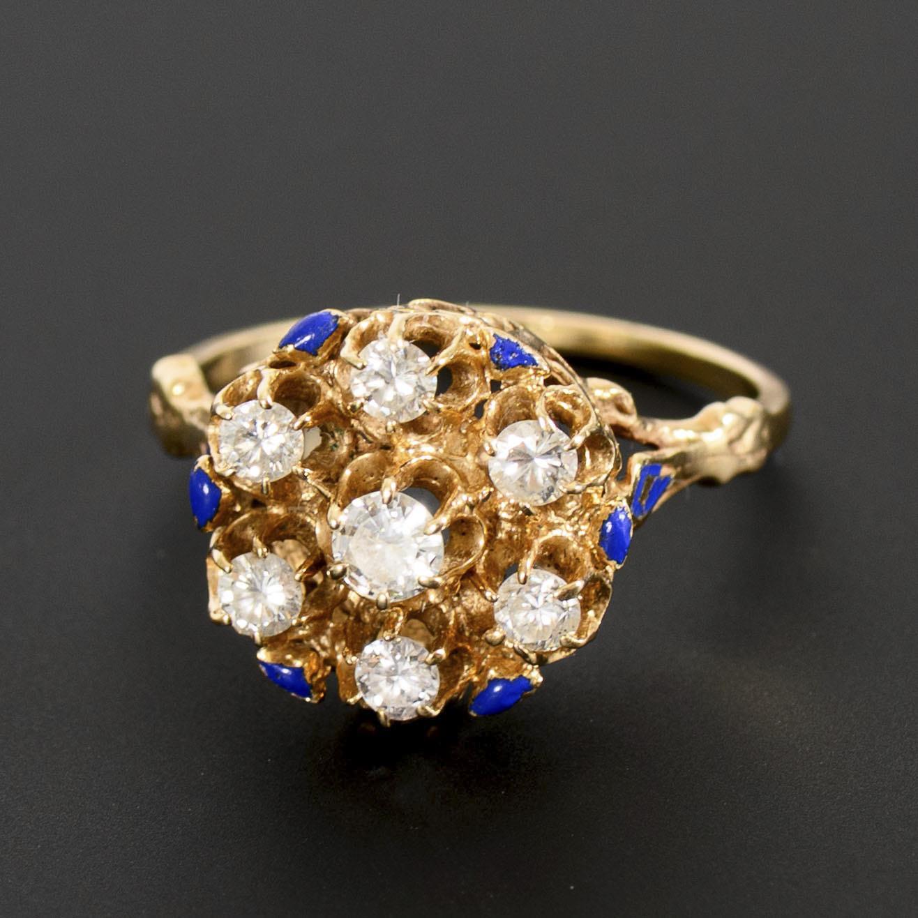 Ring with 6 smaller brilliant-cut diamonds surrounding a larger, central brilliant-cut diamond in a round ring head. Between the smaller brilliant-cut diamonds and on the ring shoulders, smaller decorations in blue cold enamel. Partial loss of material to the enamel on the ring shoulders.