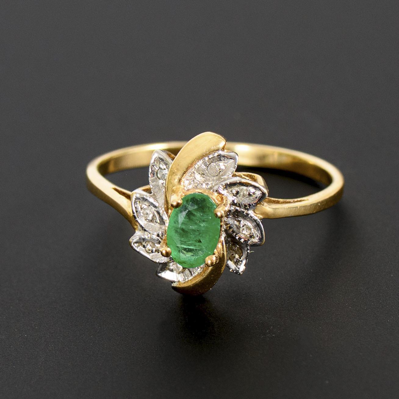 On a narrow band, a two-tone, flower-like ring head with an oval-faceted emerald and 8 small diamonds.