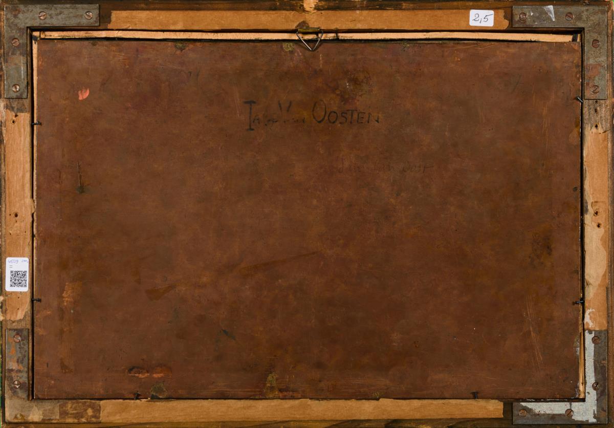 OOSTEN, Izaak van zugeschrieben (1613 Antwerpen - 1661 ebd.) Landschaft mit höfischer Jagdgruppe Öl/Kupferblech. Unsigniert, verso alt bezeichnet. 27 x 41 cm. Gerahmt: 33 x 47 cm. Die Gesellschaft zu Pferd mit Jagdhunden in der hügeligen Landschaft nahe der Burg. Altersspuren. Literatur: Thieme/Becker..