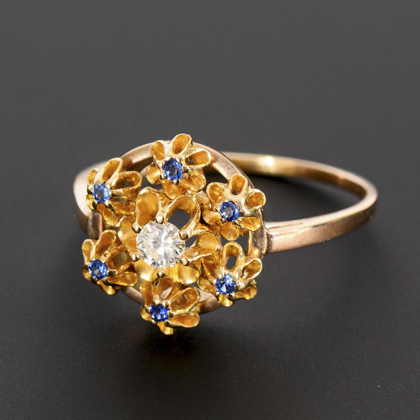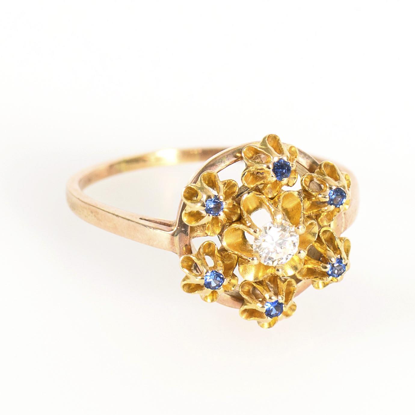Ring with hexagonal ring head, set with 6 small, blue colored stones in a raised flower setting, surrounding a larger brilliant-cut diamond in a similar setting. With traces of an earlier ring shank enlargement on the underside.
