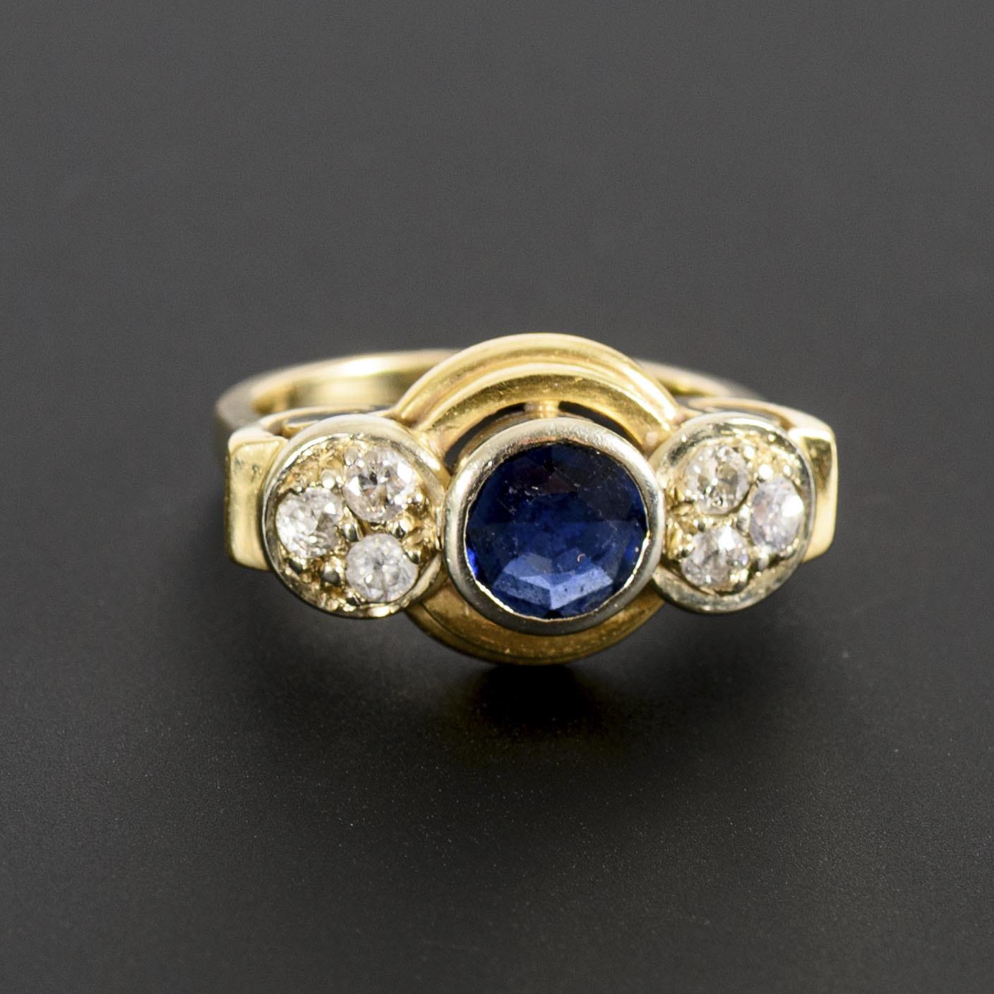 In a ring head geometrically set in circular shapes, a round-faceted blue colored stone, probably a sapphire, in a bezel setting, flanked by two pavé-set clusters of 3 diamonds each. The ring head with decorations on the sides and an architectural design. Slight signs of wear due to age, including on the cut edges of the blue colored stone, barely visible to the naked eye.