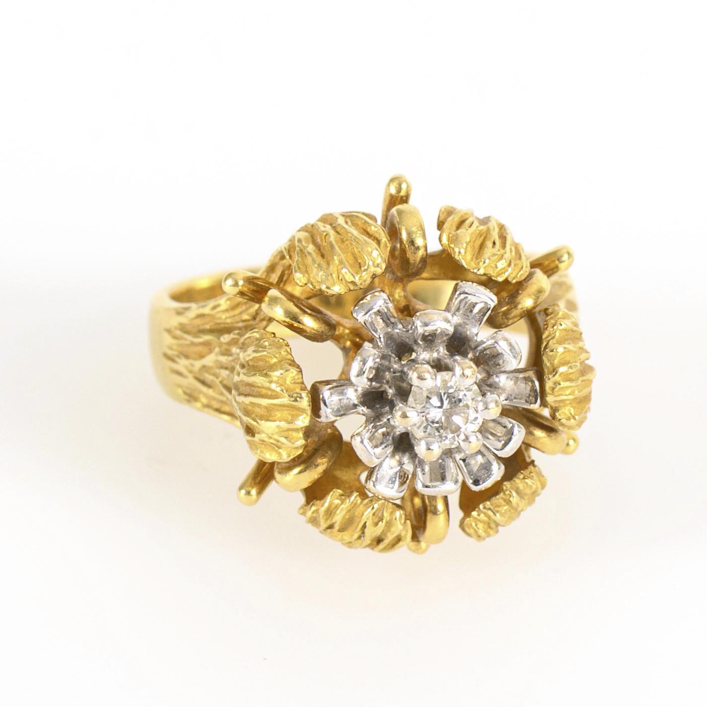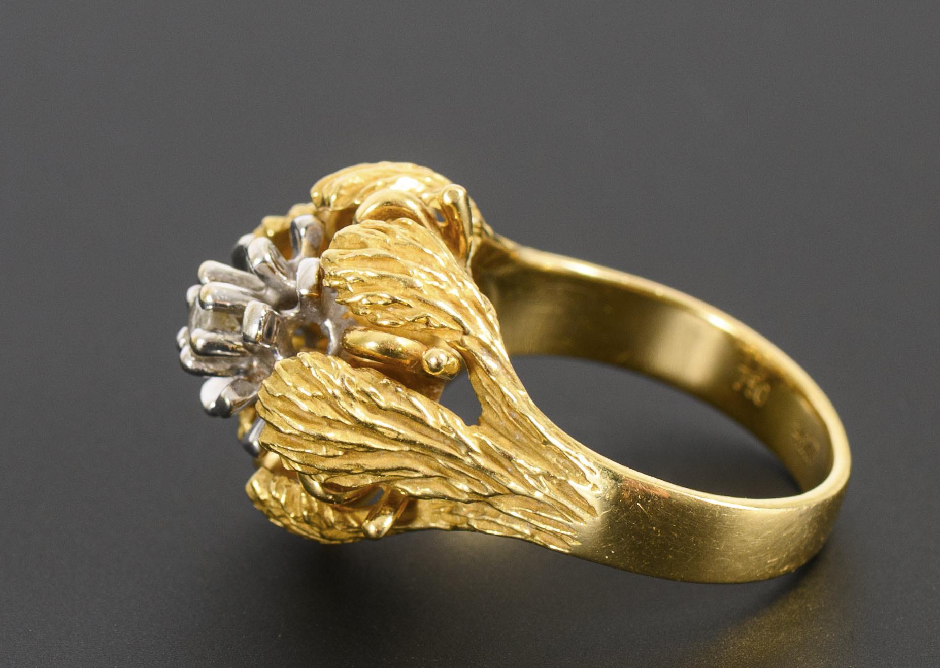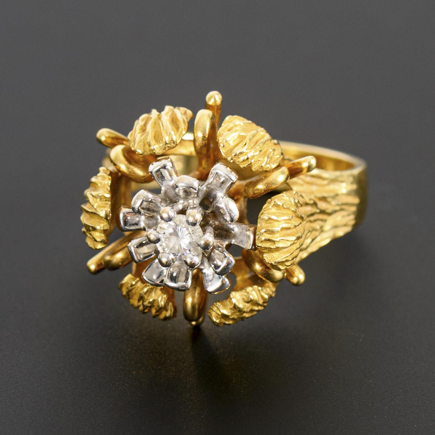 Unusual, high ring, probably unique goldsmith work, in the shape of a quasi-naturalistic blossom, a brilliant-cut diamond in the center, set in a white gold element chaton. With traces of wear on the underside.
