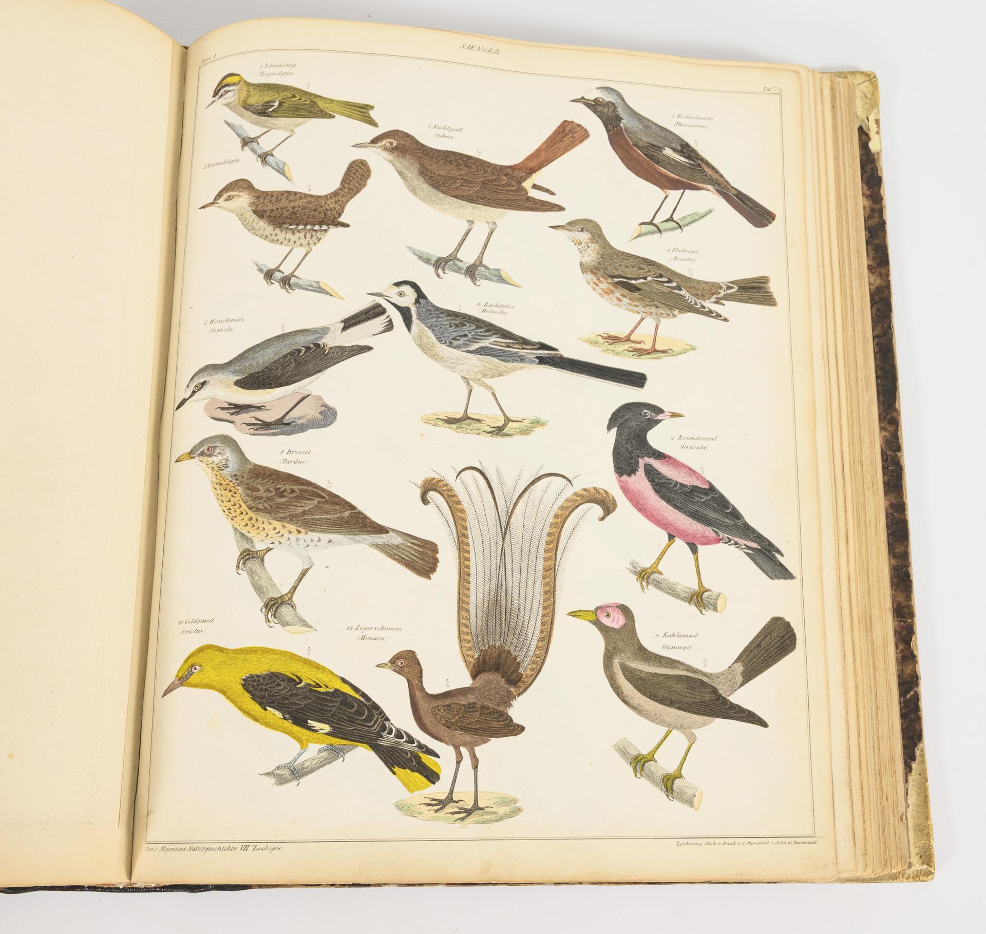 Extensive illustrated book in half leather binding with frequently colored engravings on all areas of the animal and plant world as well as geology. Several pages of text with explanations of the individual areas. Note on the flyleaf: "Knabenschule zu Schönebeck, Geschenk des Herrn Dr. Hermann" with date "1872". Binding and a few tears to the page edges professionally restored, block somewhat foxed.