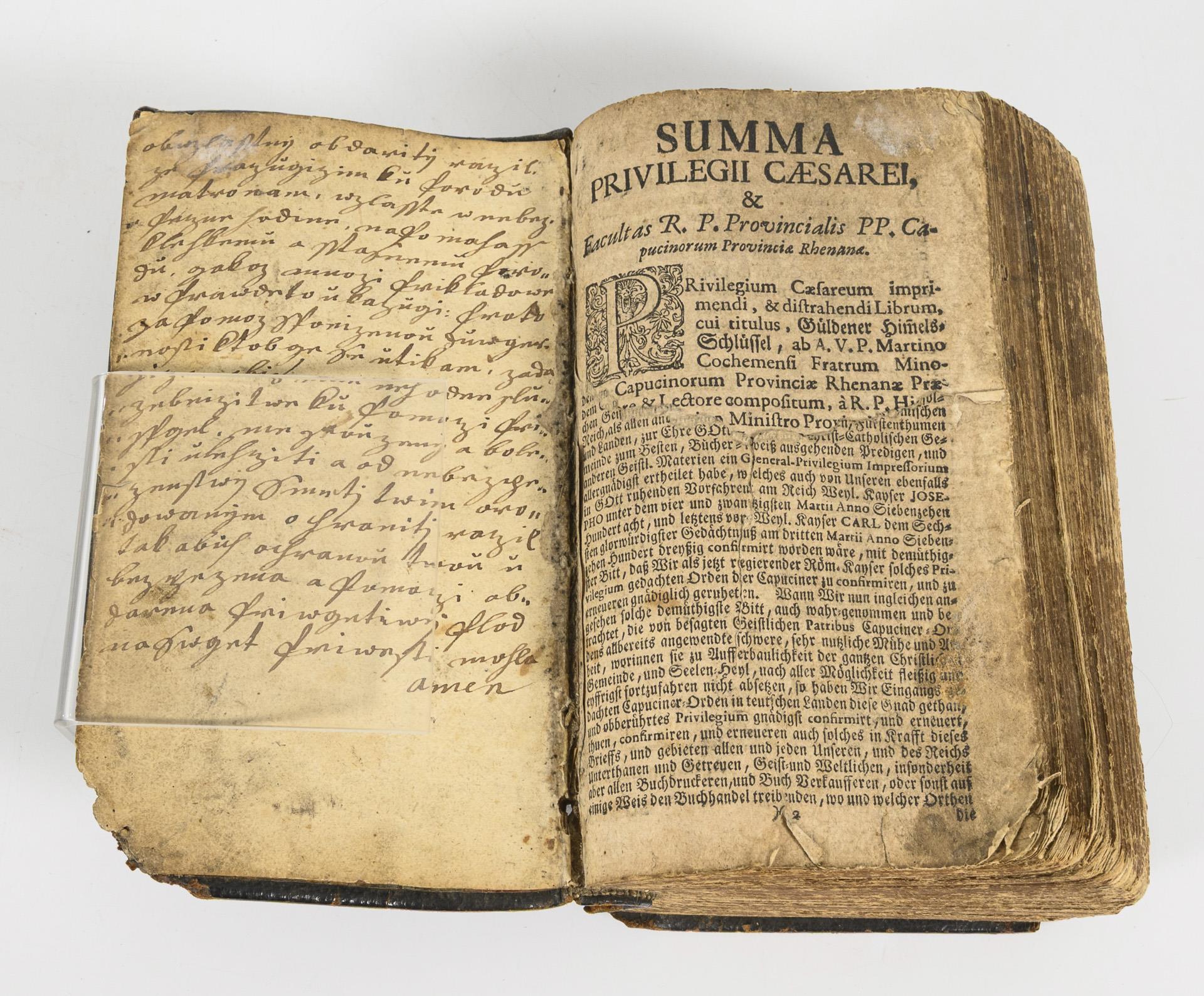 Title and first pages missing. With Imperial Privilege of Frantz, 1746, signed by Count Colloredo. Names also listed: Martino Cochemensi Fratrum Minorum Capucinorum Provinciae Rhenanae / Joanni Jonae Wolff / F. Alexander, Aschaffenburg. Further references from 1691 and 1689.