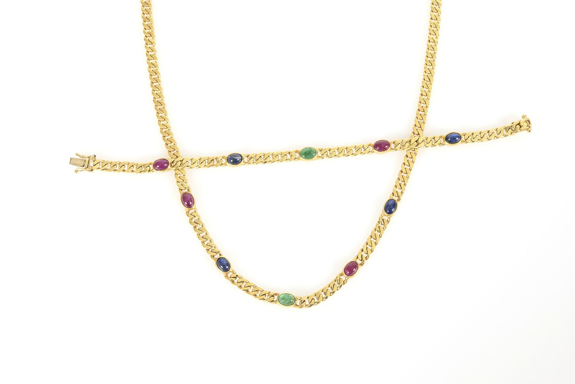 Wide, flat curb chains, each set with 5 colored stone cabochons: one green (probably emerald) and two red and blue (probably ruby and sapphire). The bracelet with double, the necklace with single figure-of-eight safety catch on the box lock. With slight signs of wear.