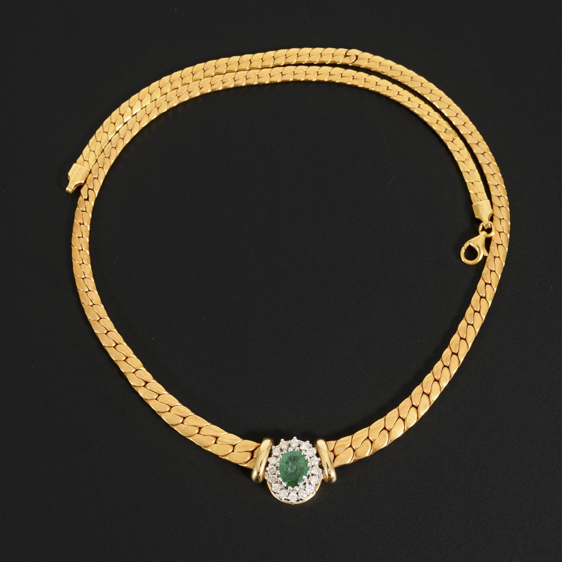 Broad necklace in yellow gold with entourage of a green colored stone, probably emerald, and small brilliant-cut diamonds in white gold. One link with dent.