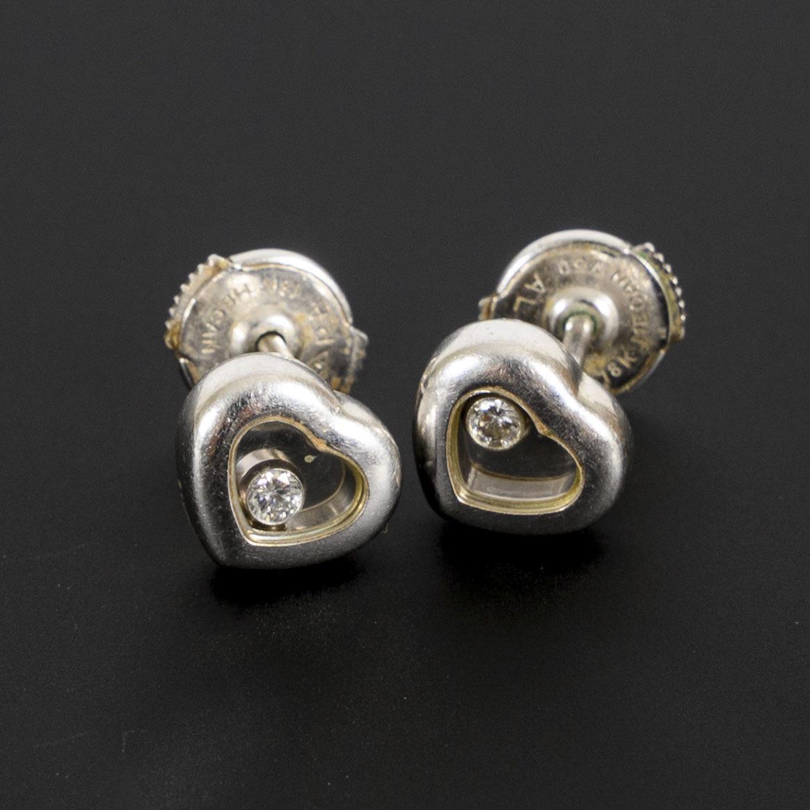 Pair of stud earrings by Chopard from the "Happy Diamonds" design series, heart-shaped, each with a brilliant-cut diamond inside, deliberately not set in mirror image, set in a sapphire glass frame. Traces of wear, the diamonds fixed on the back and no longer freely movable.