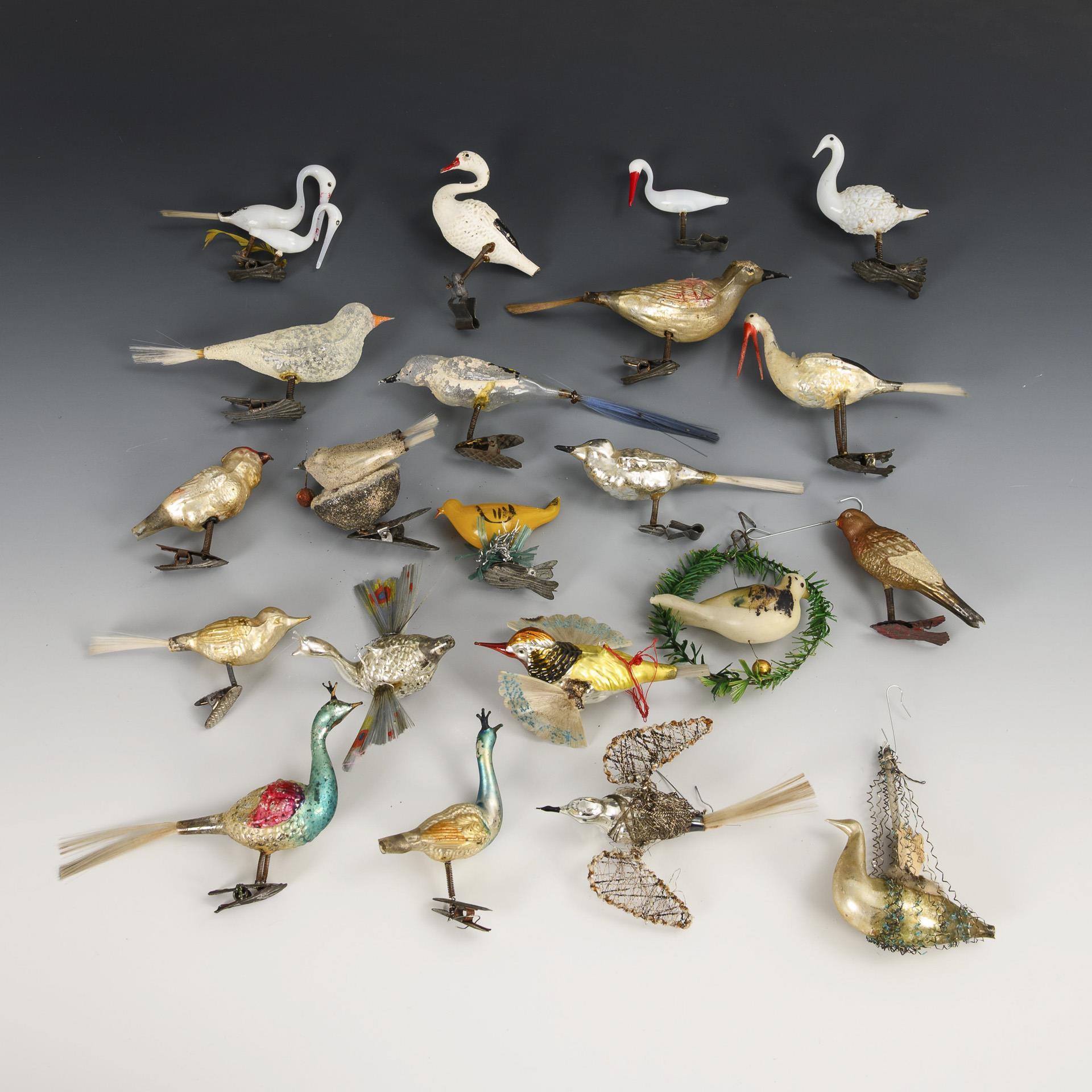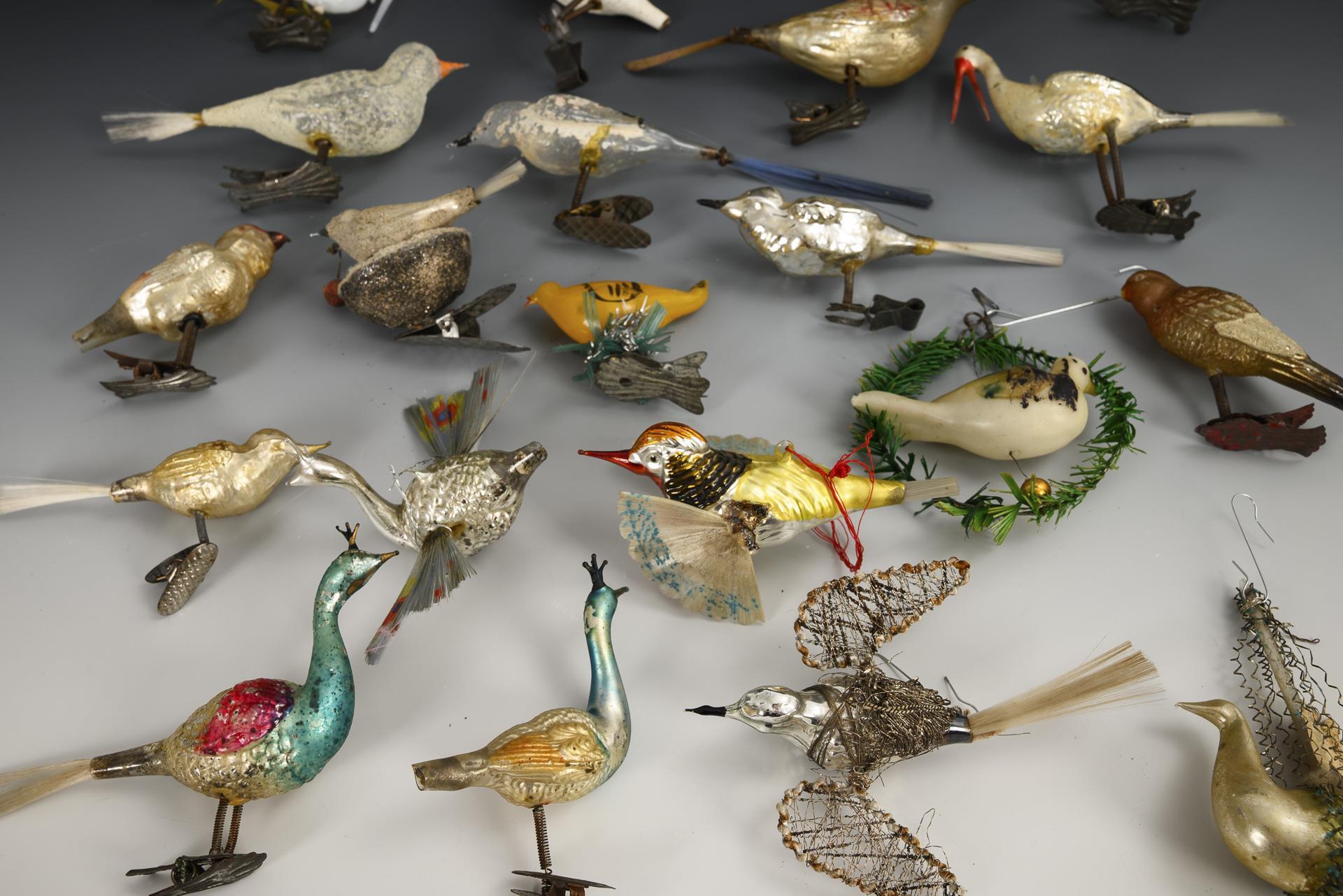 For the Christmas tree. Approx. 21 different birds, some with fiberglass tails. Partly with signs of age and defects.