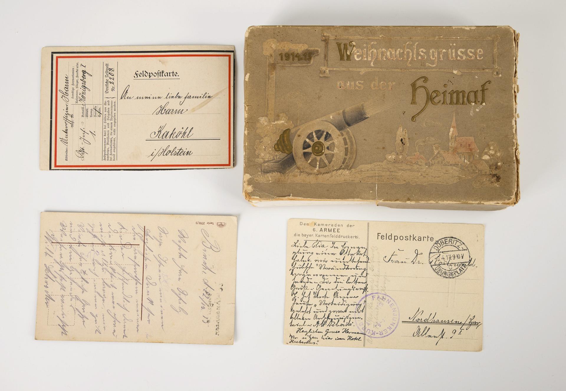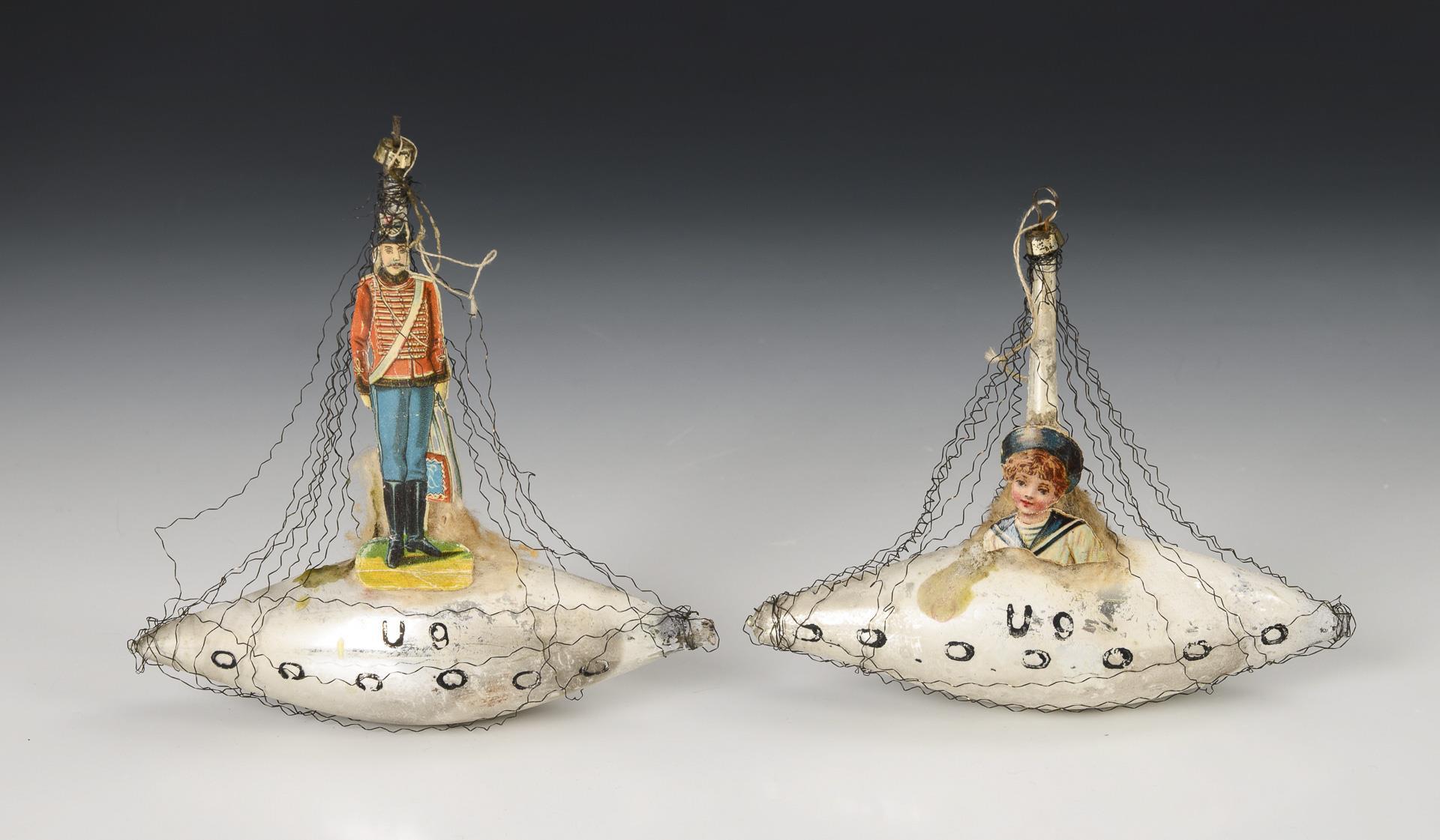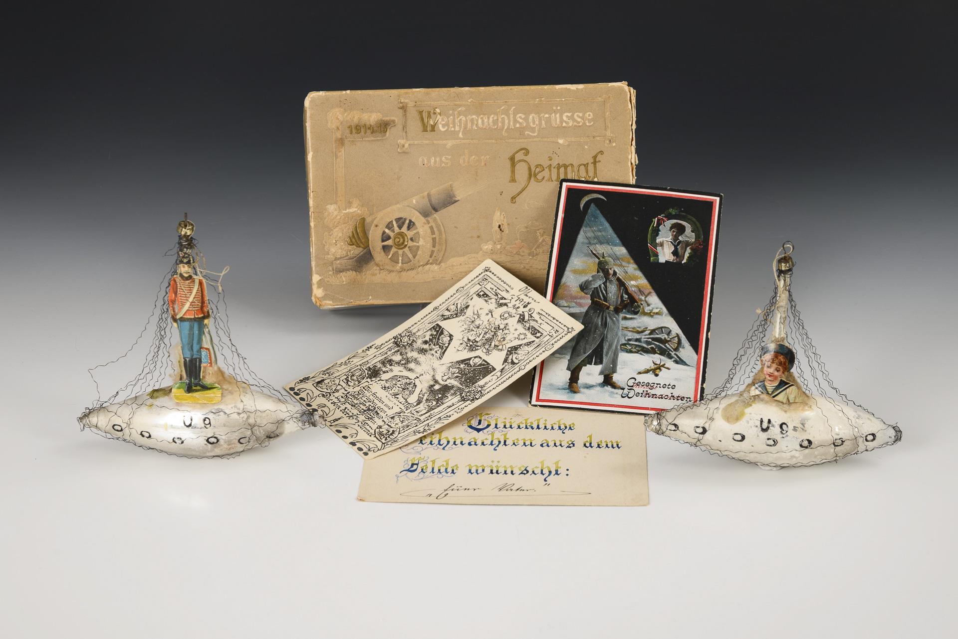 Glass decorations for the Christmas tree: 1x with soldier, 1x with sailor, each approx. 13 x 13 cm. Comes with box "Christmas greetings from home" with 3 postcards from 1915-17. Signs of age.