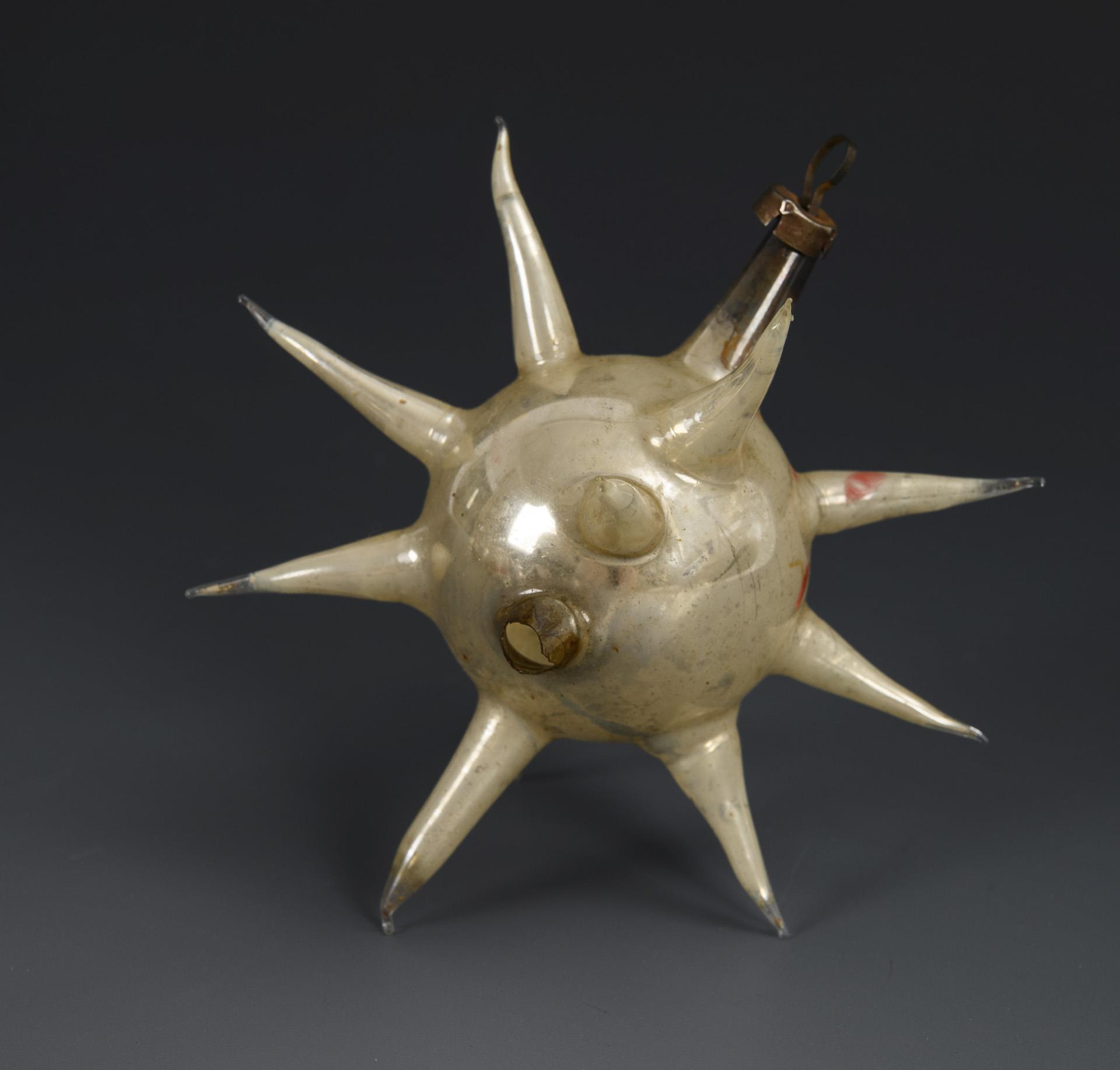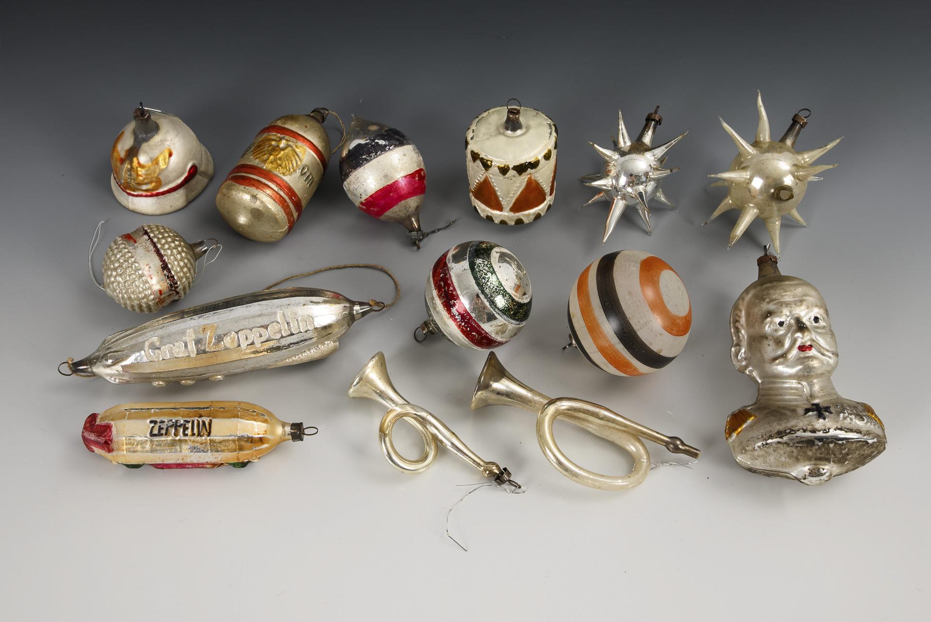 Partly patriotic decoration for the Christmas tree: various baubles, Kaiser Wilhelm head, drum, helmet, 2 zeppelins etc. Signs of age, paint rubbed off, 1 morning star with broken tip.