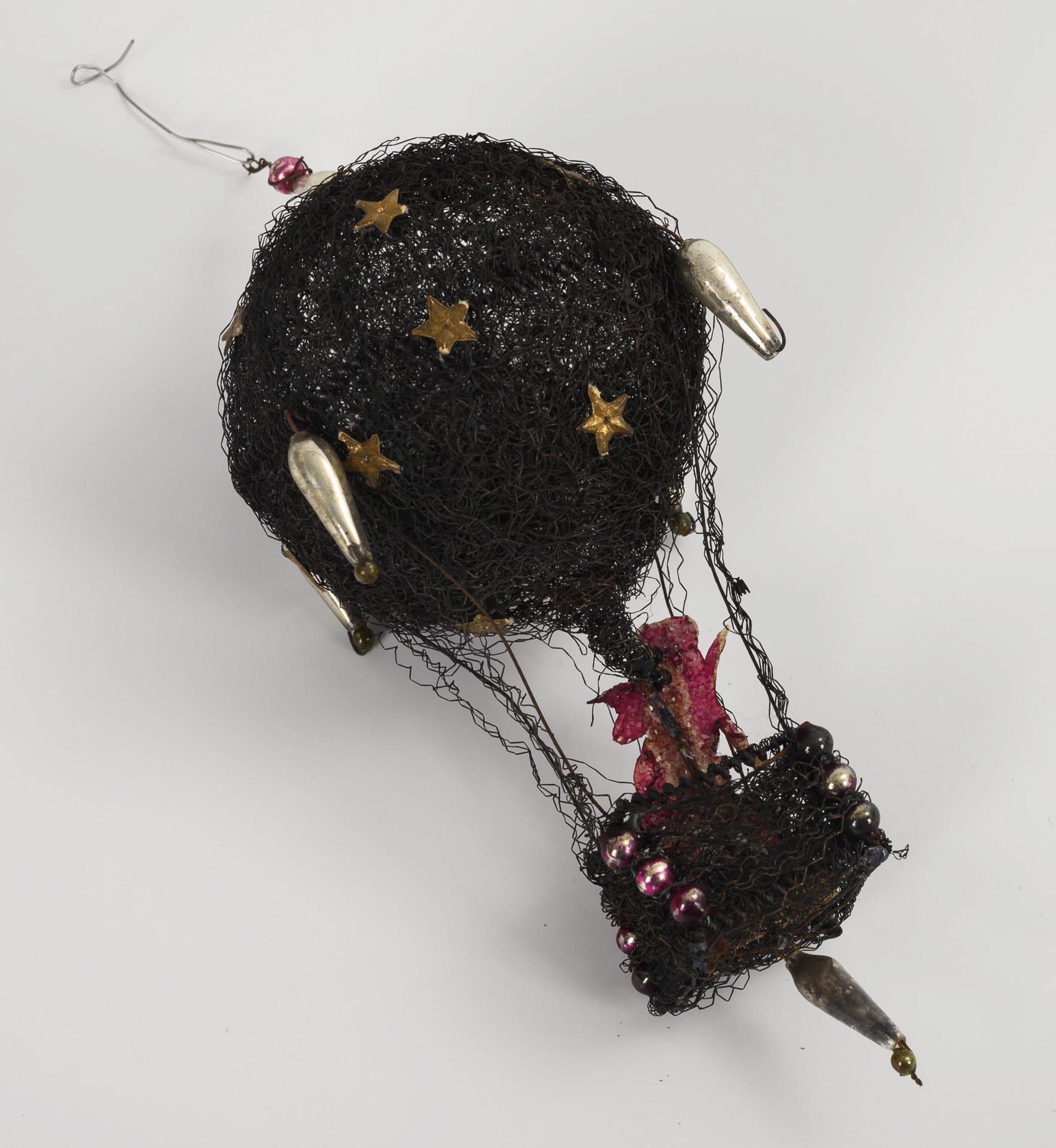 For the Christmas tree. Balloon made of blackened wires with glass cone and small cupid. Minimal signs of age.
