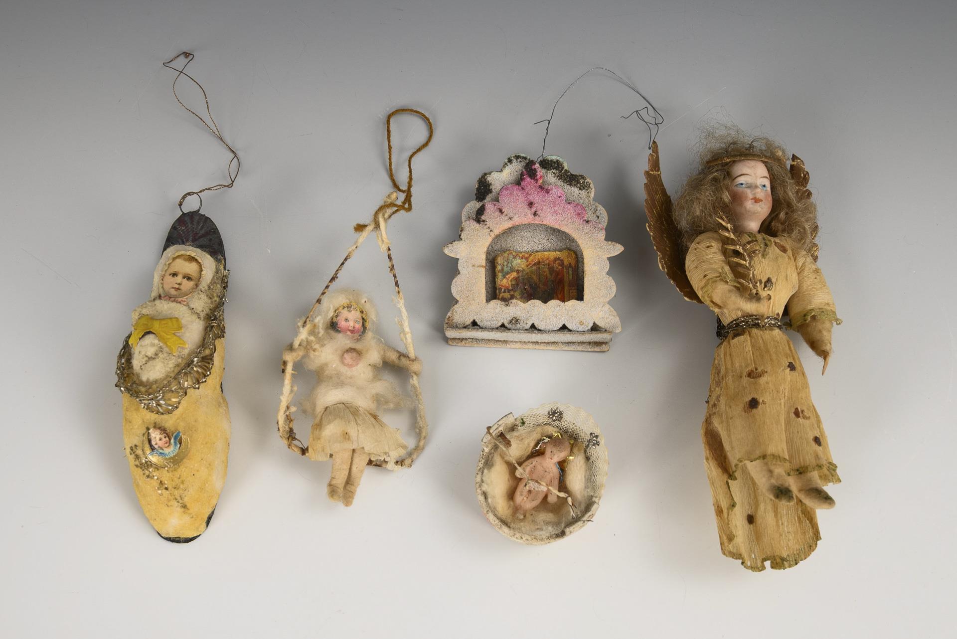 Various parts for the Christmas tree: small nativity scene, angel, Christ child in basket, absorbent cotton child on swing and baby in slippers. Signs of age, small defects.