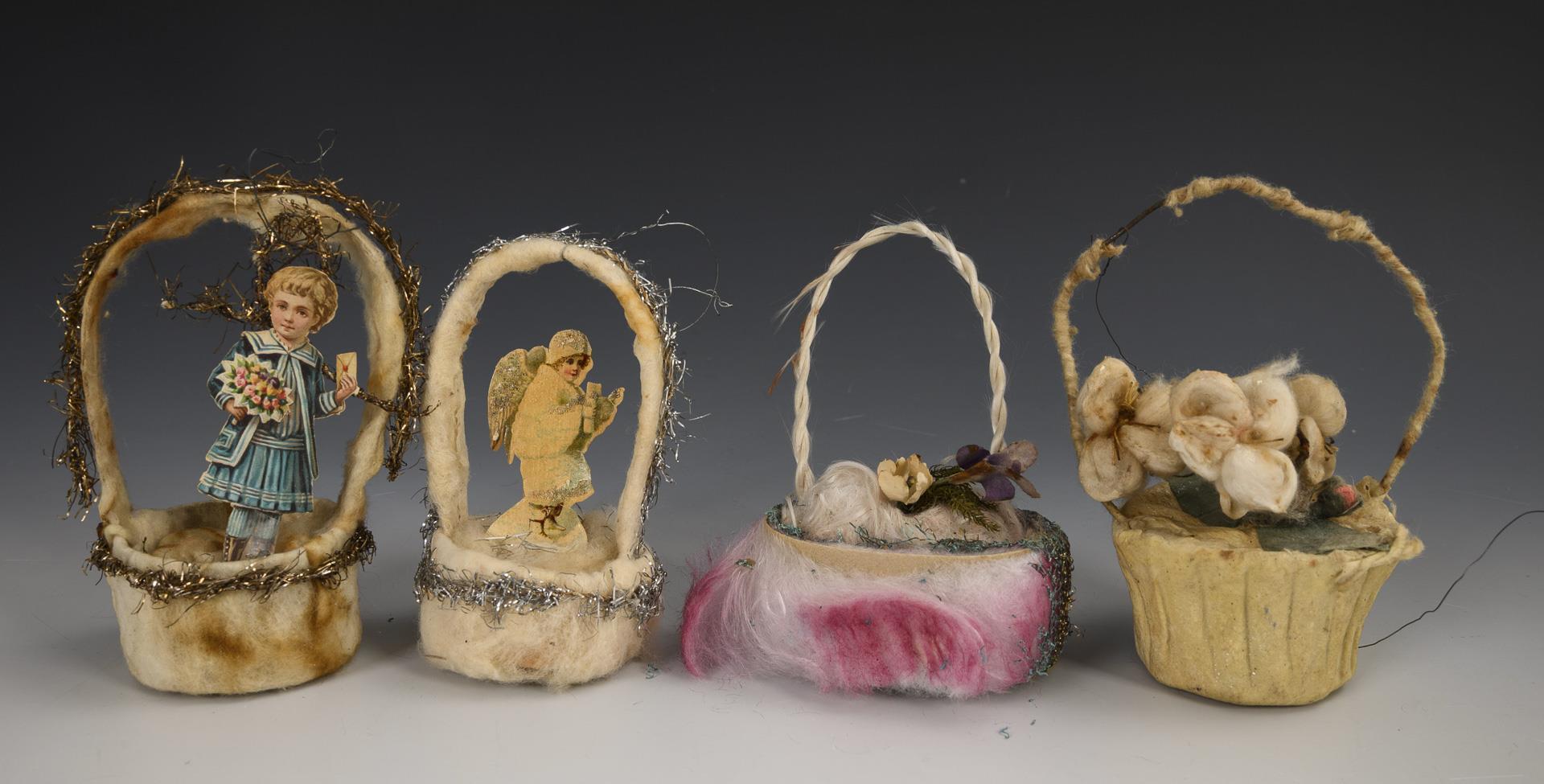 Cotton wool decorations for the Christmas tree: 4 baskets and 3 cones. Signs of age.