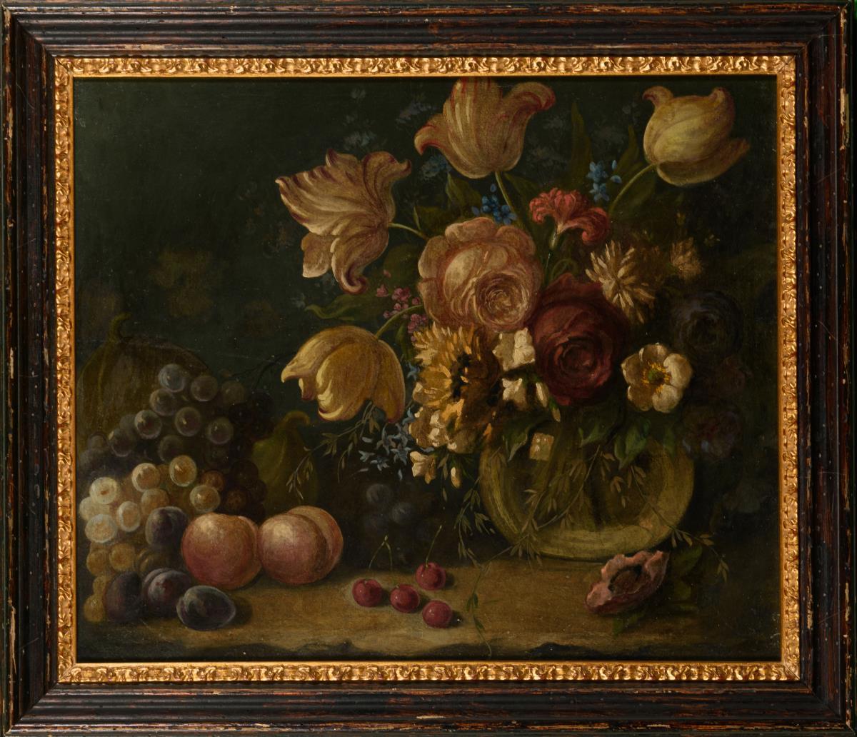 Großer Blumenstrauß in transparenter Glasvase neben Melone, Pfirsichen und Trauben. Leinwand doubliert..