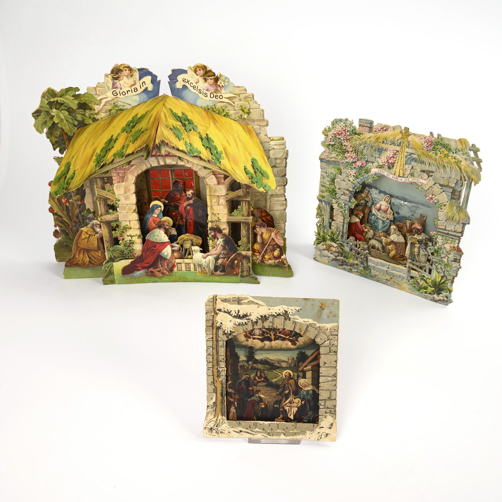 Nativity scenes with the adoration of the infant Jesus by the Magi and partly the shepherds in the manger. Largest nativity scene overpainted and partly glued, smallest with small missing part on the background, otherwise few traces of age/use.