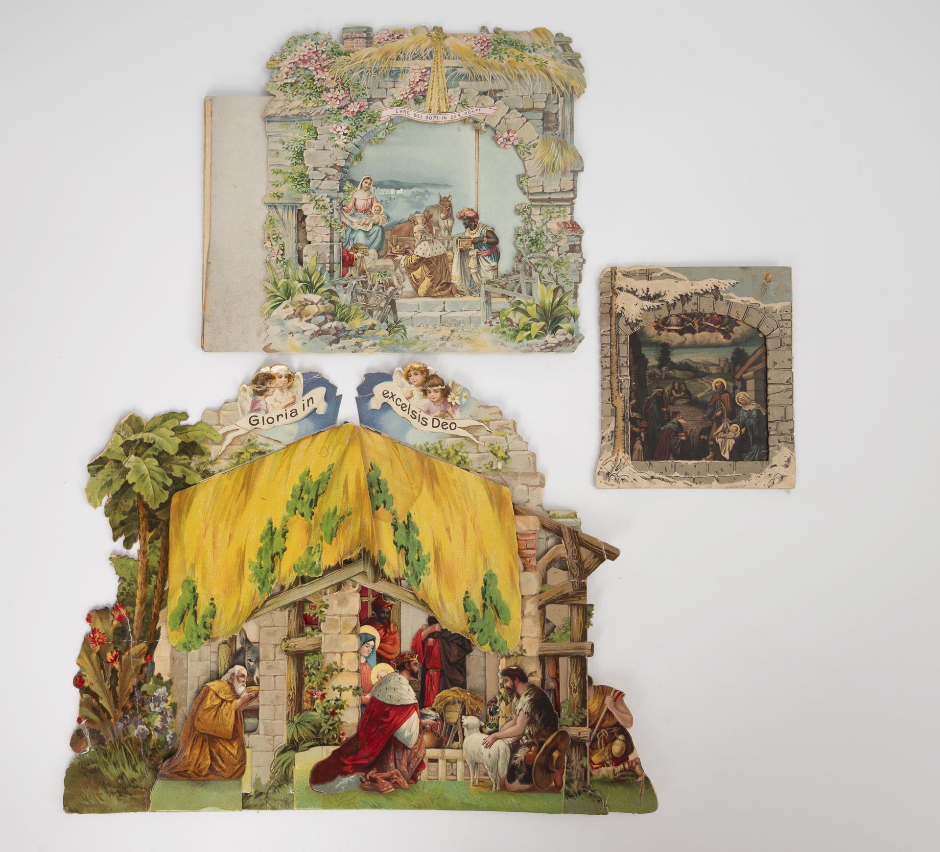 Nativity scenes with the adoration of the infant Jesus by the Magi and partly the shepherds in the manger. Largest nativity scene overpainted and partly glued, smallest with small missing part on the background, otherwise few traces of age/use.