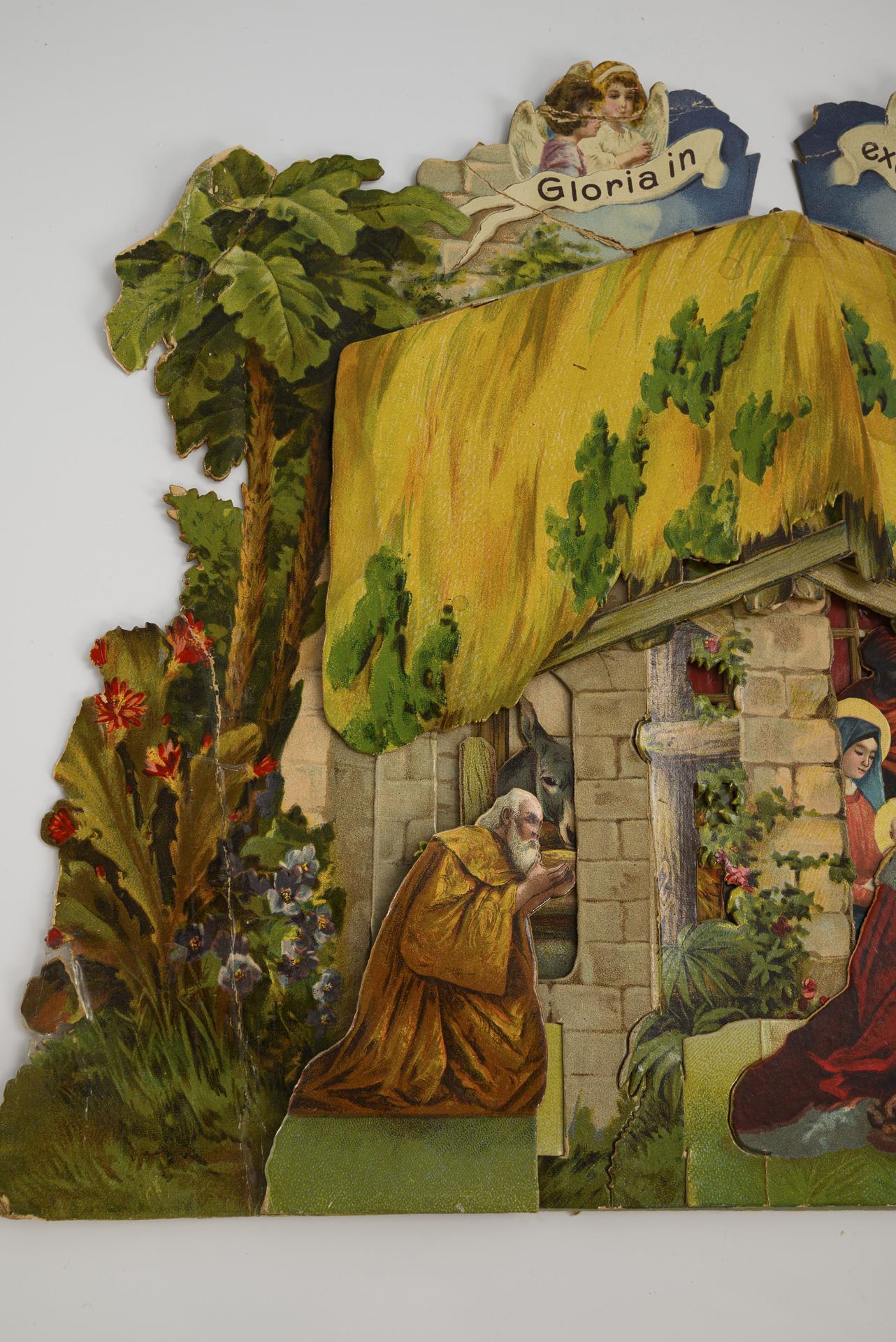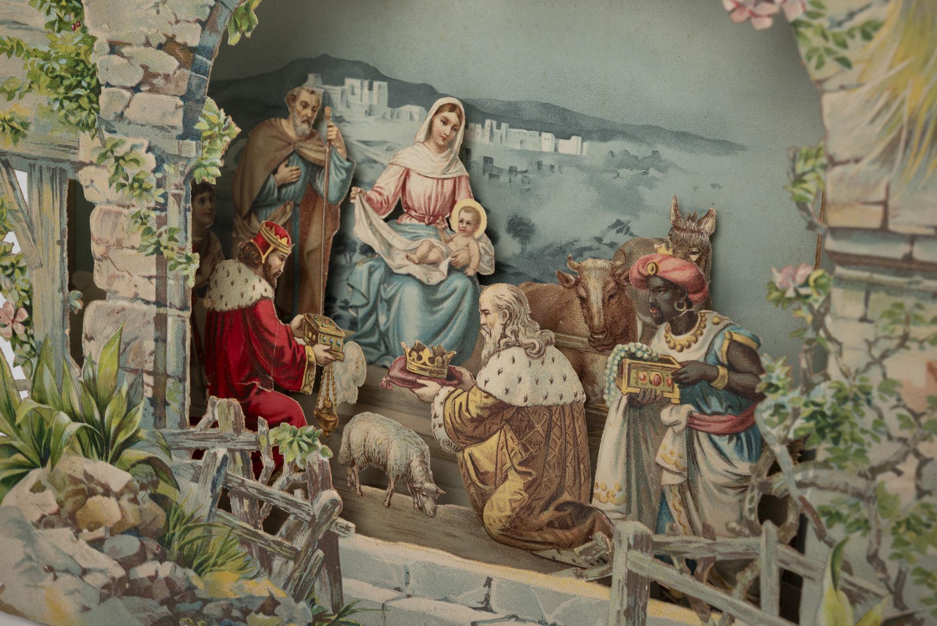 Color lithographs/cardboard and 1x /paper, 1x embossed and decorated with gold glitter. 1x in 5 layers. Maximum 33 x 41 x 12 cm.