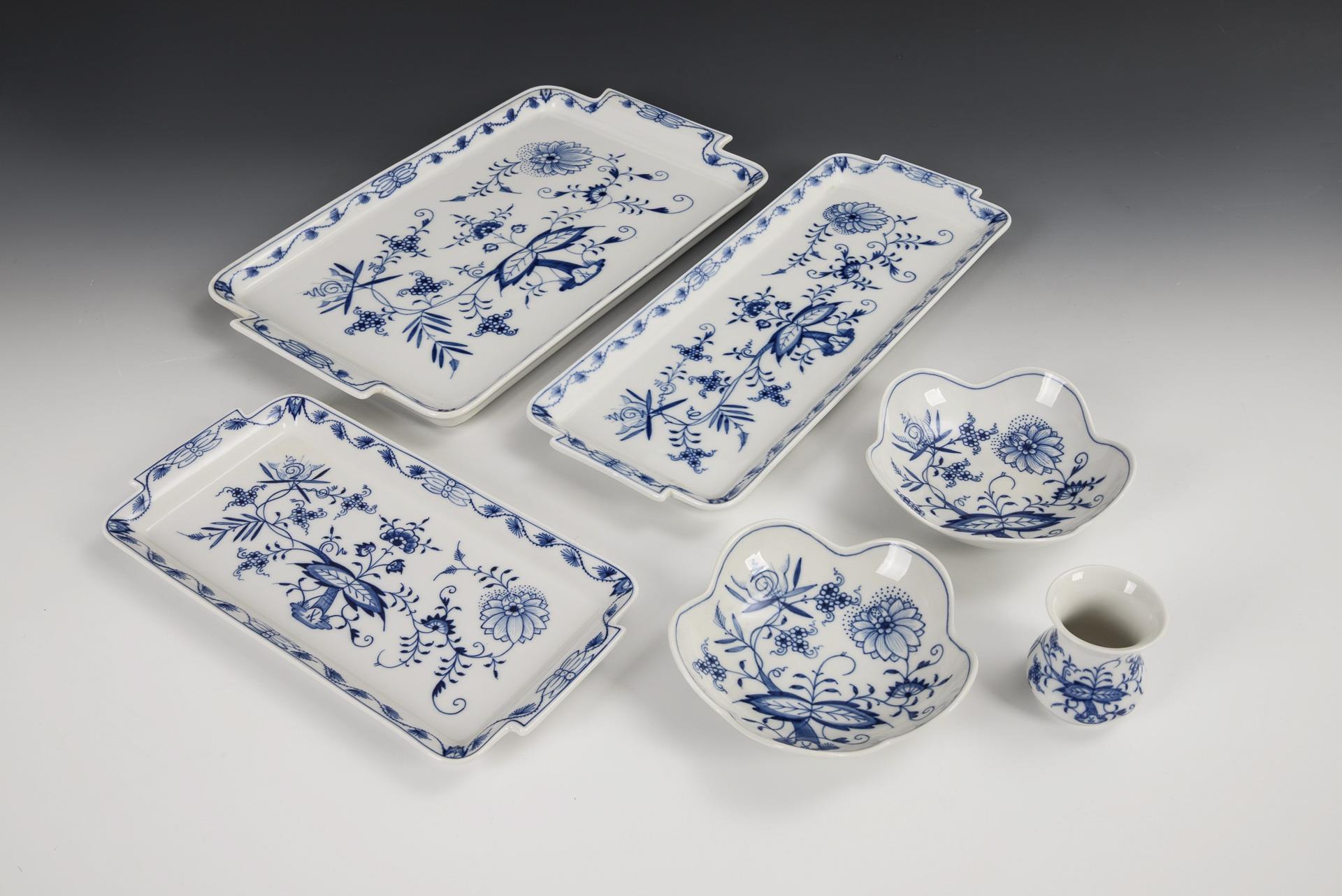 3 onion pattern cake plates, 2 saucers and 1 vase. Meissen.