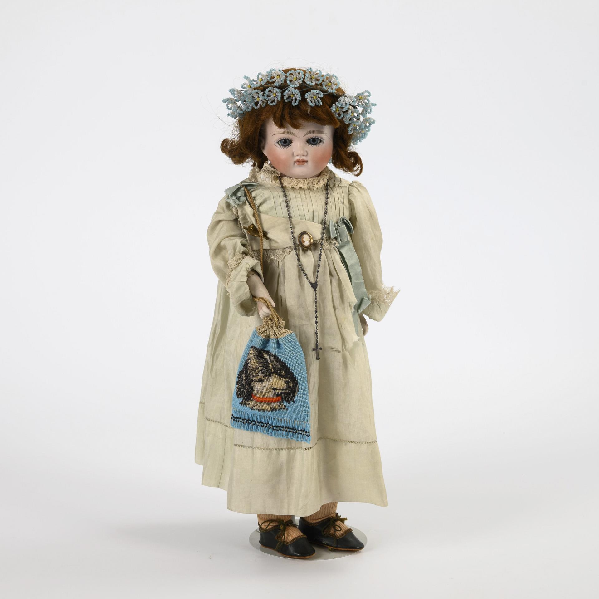 Blue sleeping eyes, closed mouth, auburn wig, slender leather body with gussets, pale blue silk dress, 2 brooches, beaded bag with dog's head, old oilcloth shoes. Neckline restored, dress partially torn.