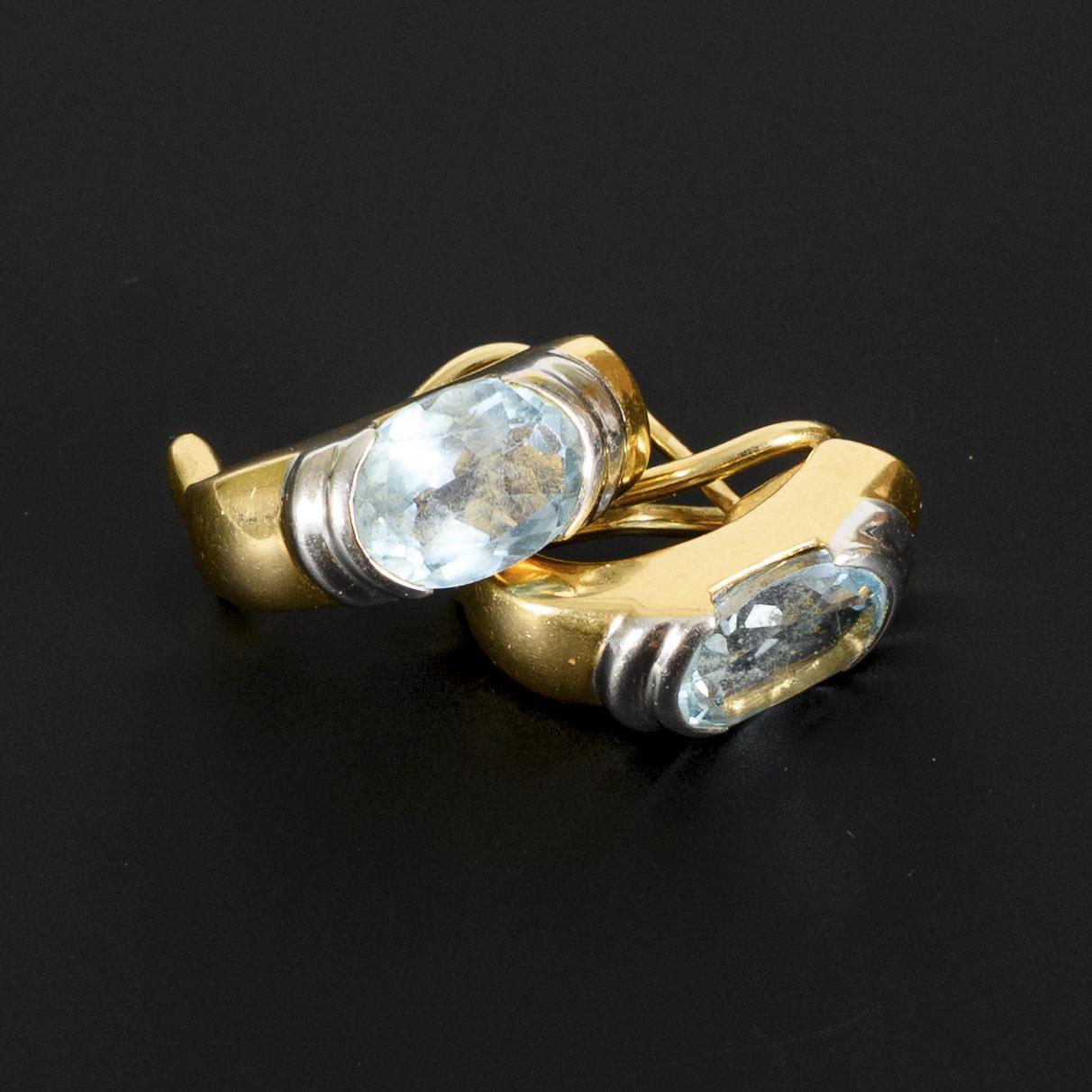 Clip stud half-creoles, bicolor set, each with a light blue oval-faceted coloured stone, probably topaz.
