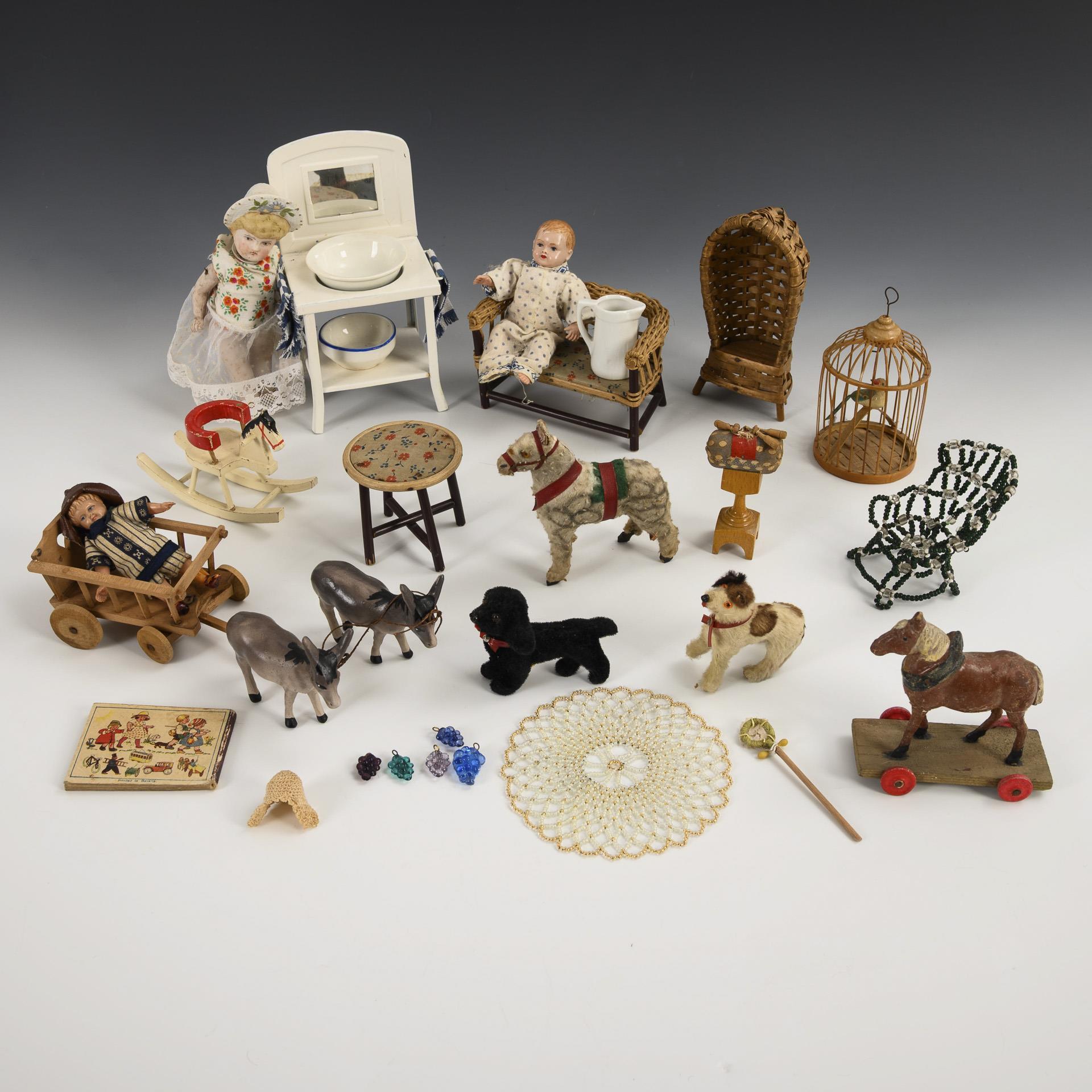 Various furnishings: 3 pieces of garden furniture, tin washstand, birdcage, handcart, rocking horse, etc. Plus 3 dolls, 2 dogs, 2 horses and 2 donkeys. Partly with signs of age.