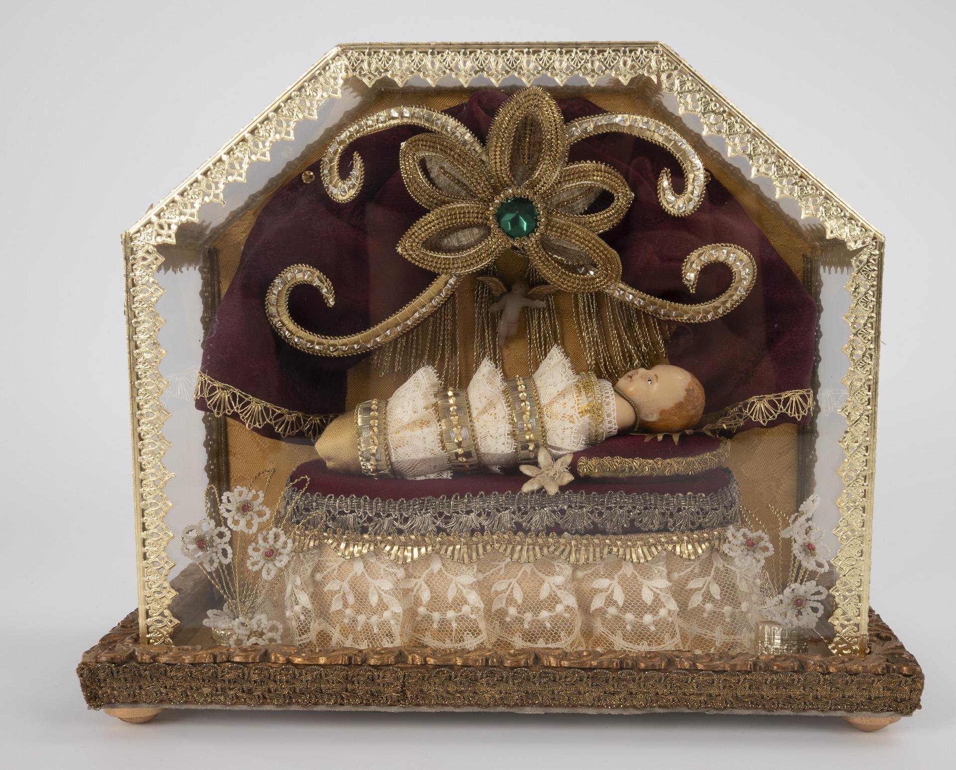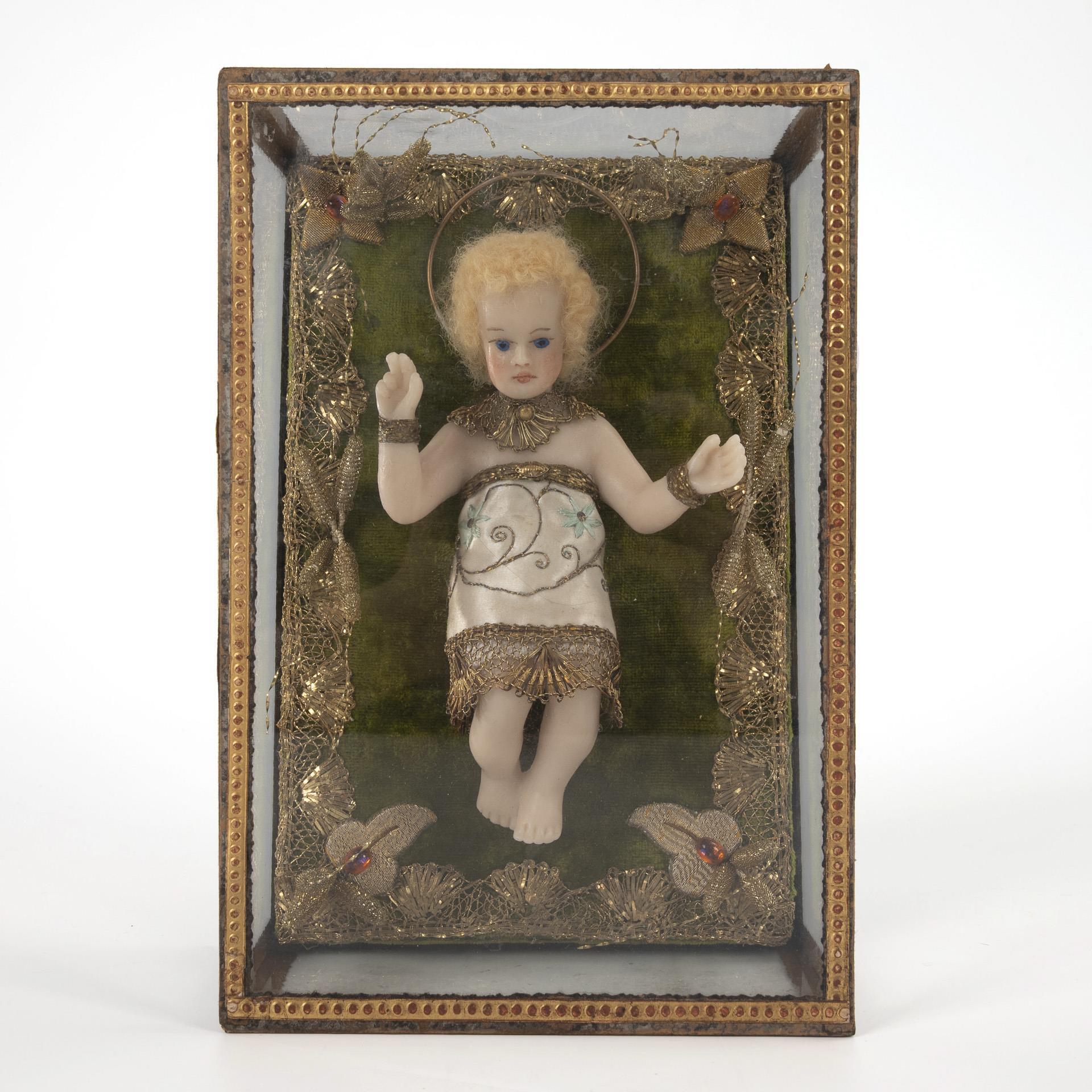 1 reclining Infant Jesus with blessing gesture, 1 Fatschenkind (Augustinerkindl), 1 standing Infant Jesus with tunic in blessing gesture. 1 cracked disk.