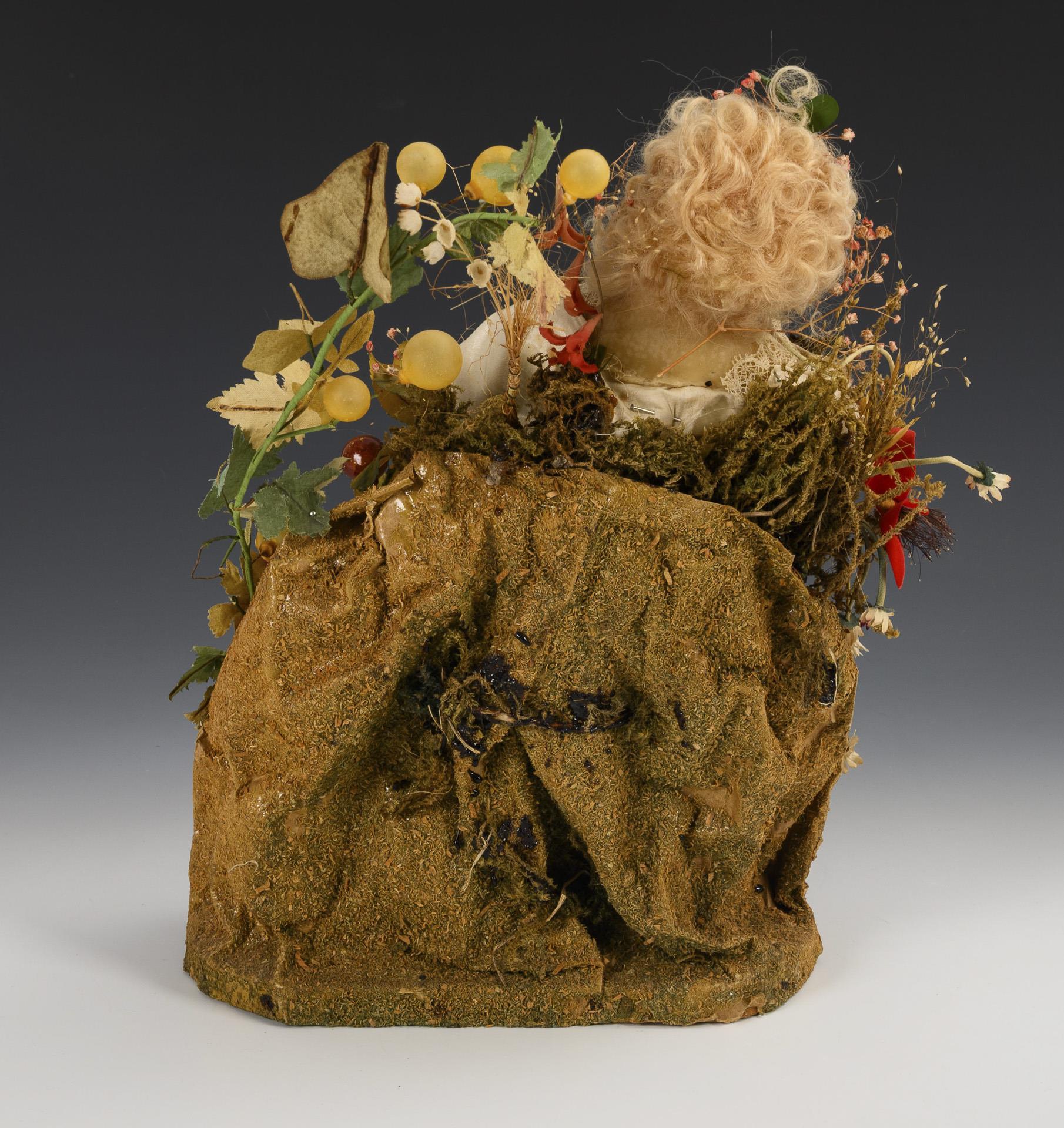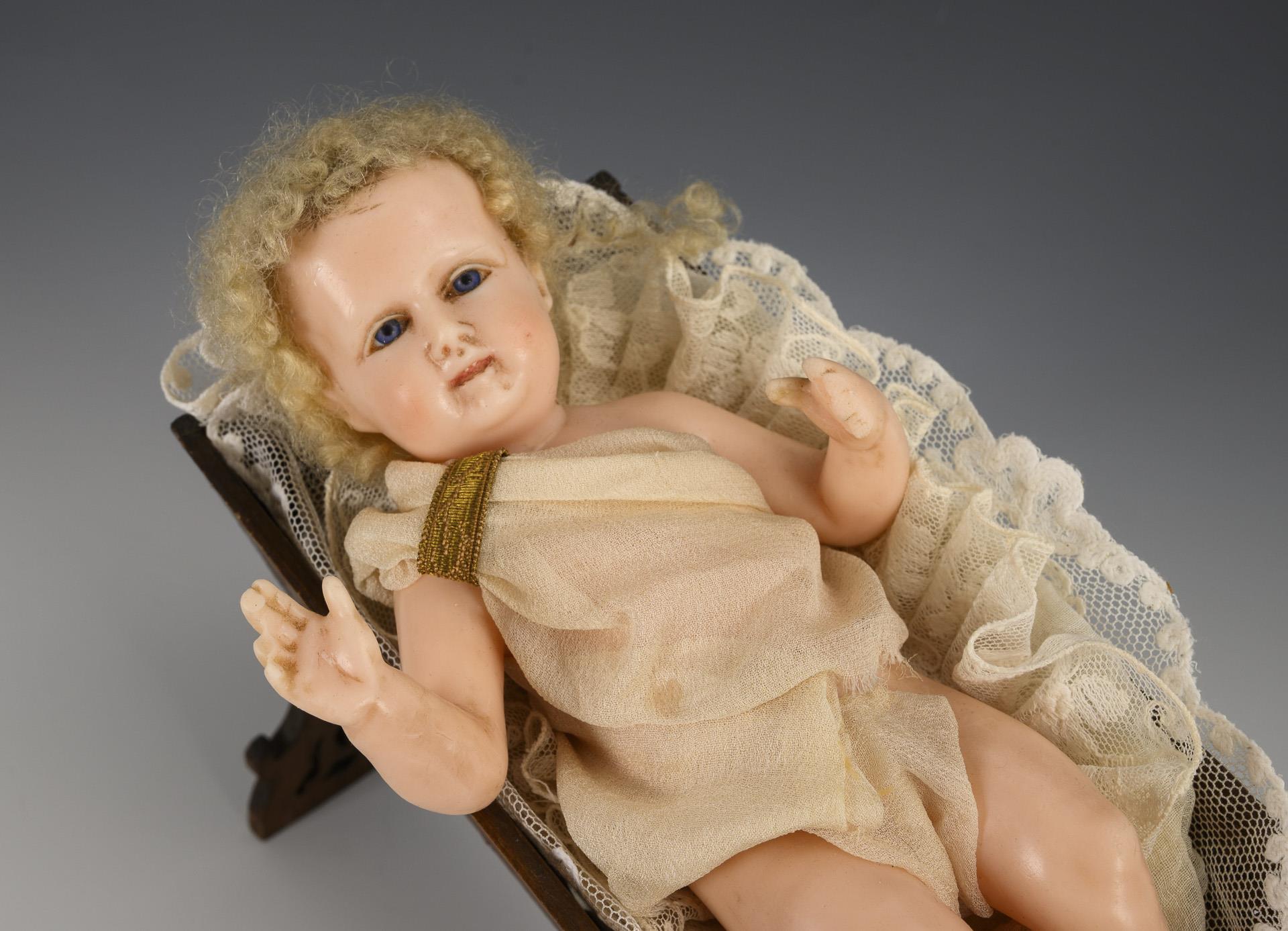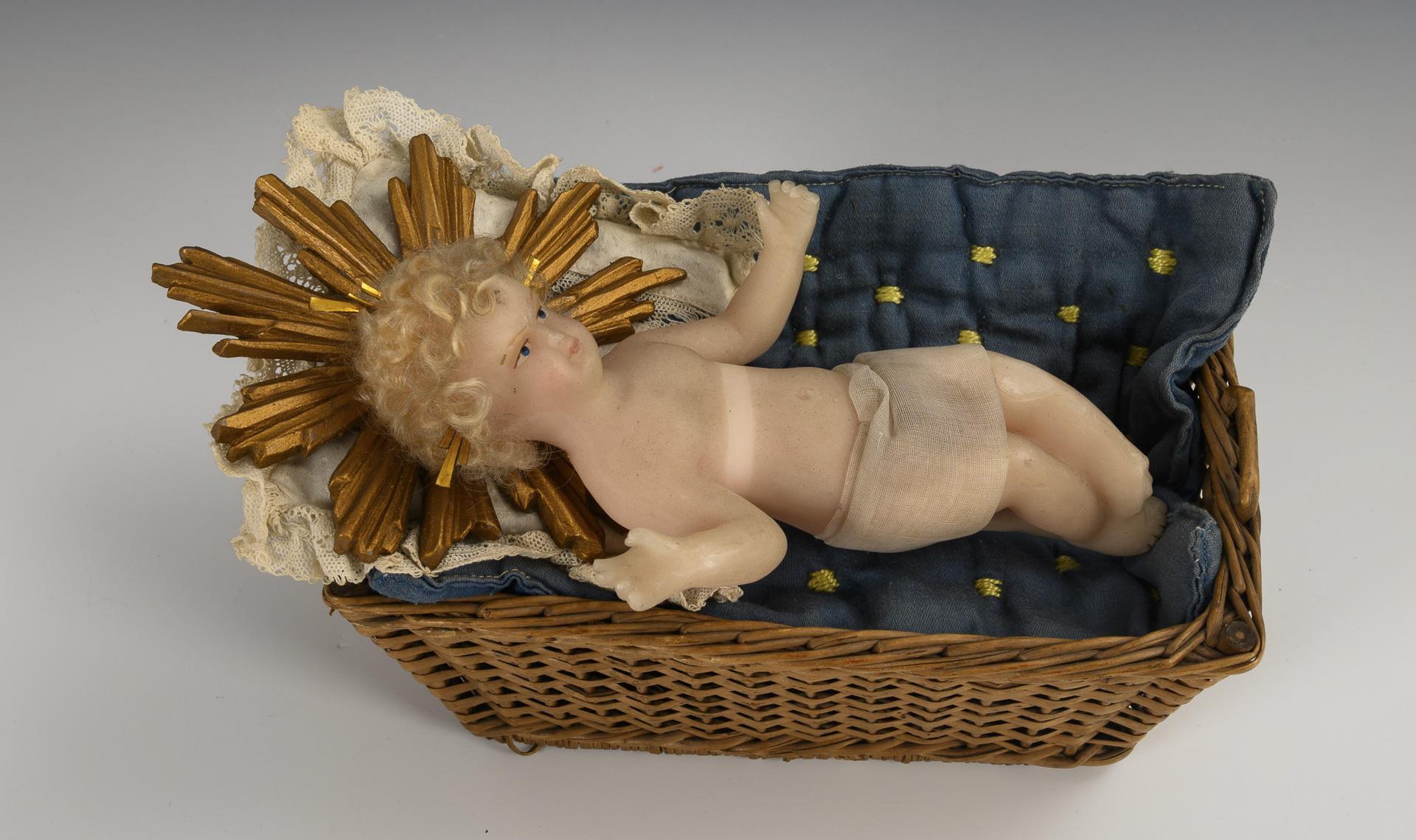 Wax, partly painted, 1x body, 2x glass eyes, each with blond mohair hair, monastery work, fabrics, paper, wood or wicker basket. Maximum size 32 x 23 x 15 cm.