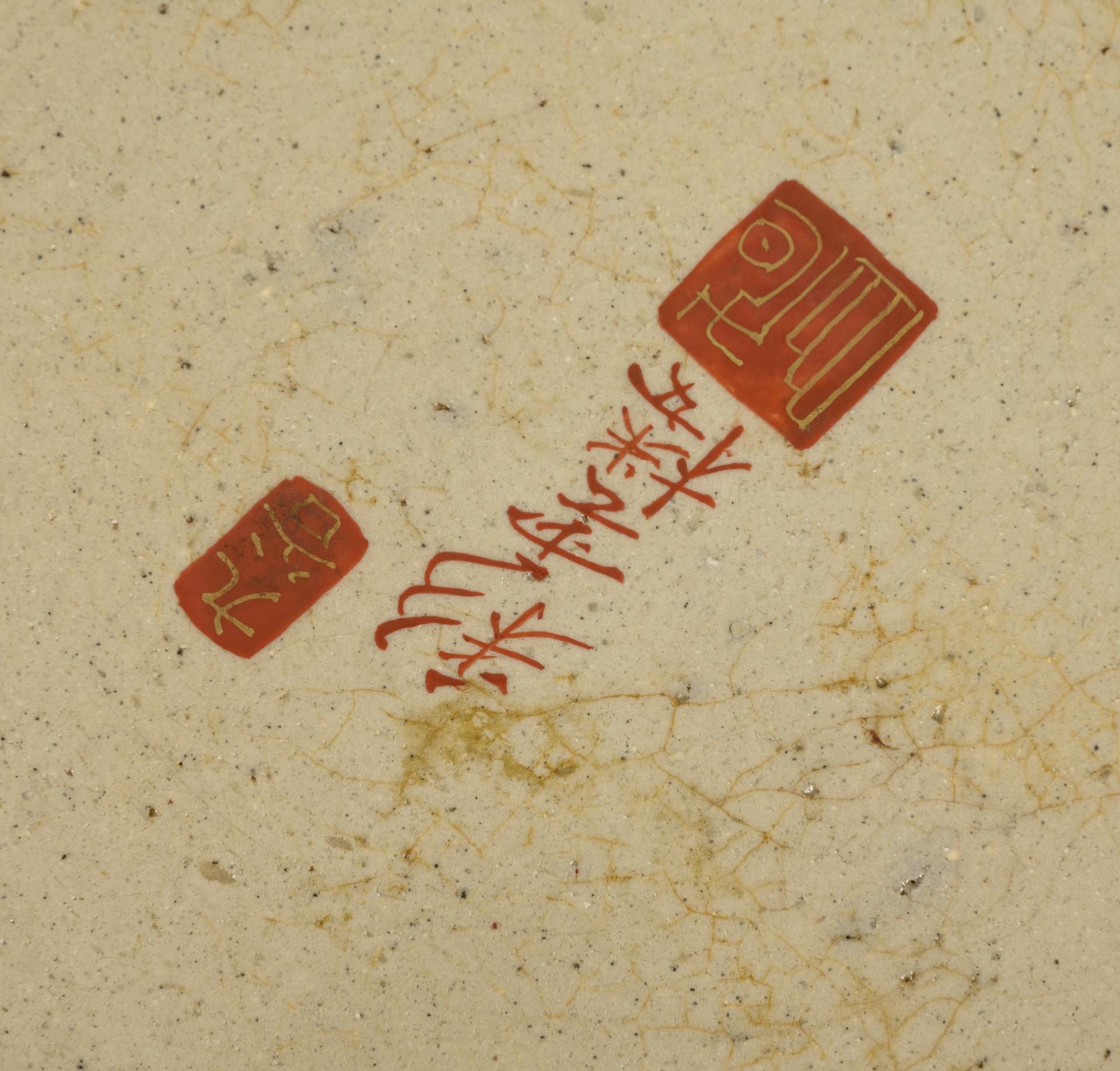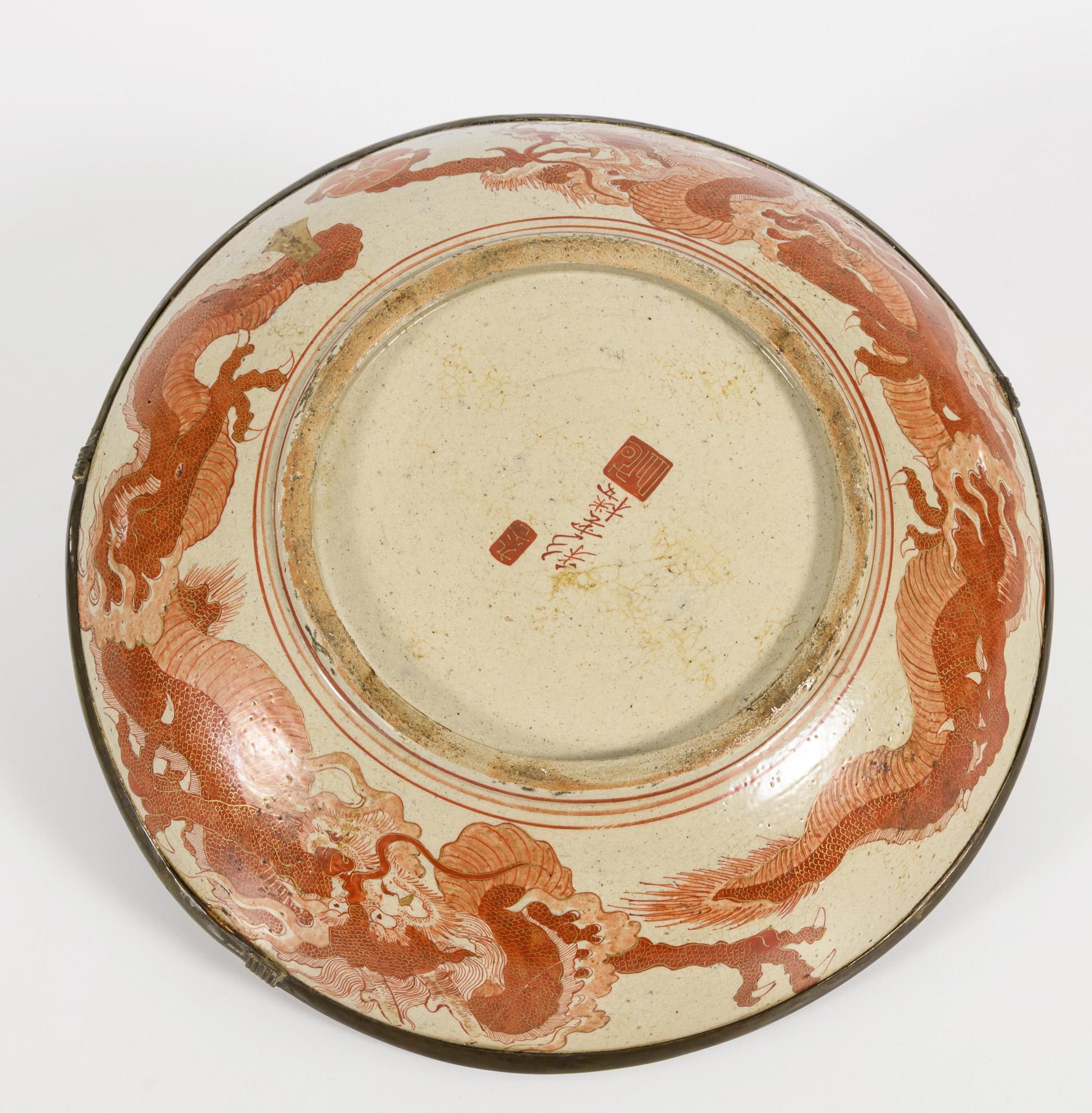 Extremely finely painted plate on the front and back with figural scenes on the rim, drum and cockerel in the mirror and dragon on the underside. Depth effect is achieved through finely dotted surfaces. Set in a narrow brass rim. Probably belonging to Kutani or Arita art.