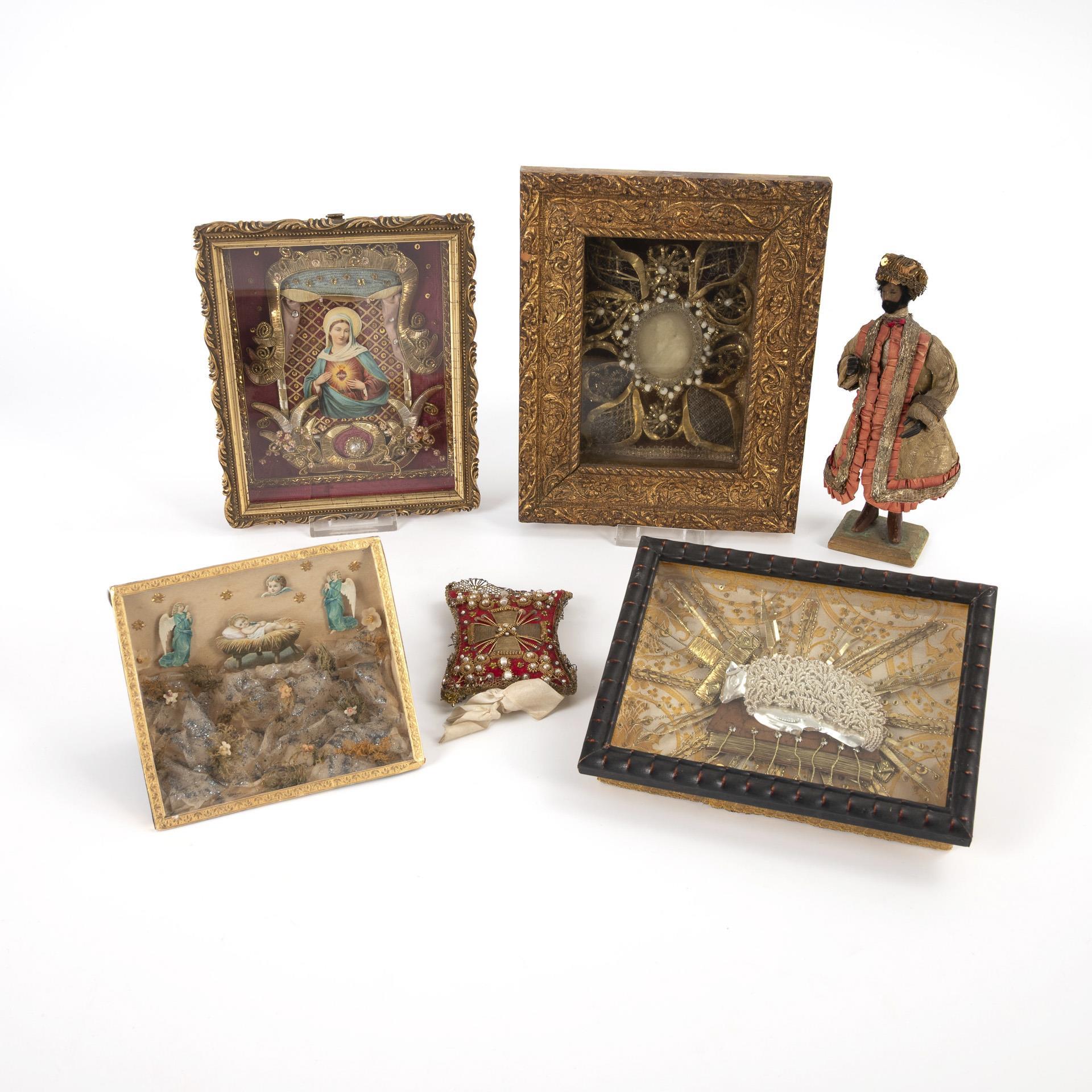 African standing on a plinth in splendid robes. / 4 glazed display cases with monastic works: Wax portrait relief of Pius V, Immaculate Heart of Mary, apocalyptic lamb on the book with 7 seals, adoration of the infant Jesus in the crib by angels / Breverl cushion with rich monastic work, print on silk on the reverse: Our Lady on Mount Carmel with the inscription "Ecce Signum Salutis". Crib figure and case slight signs of age/use.