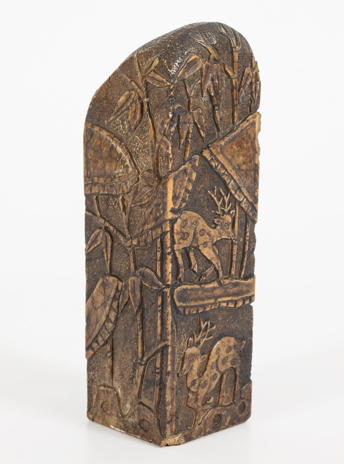 Rectangular stone with depiction of animals and palm trees in bas-relief. Underside with red-colored characters. Irregular upper end.