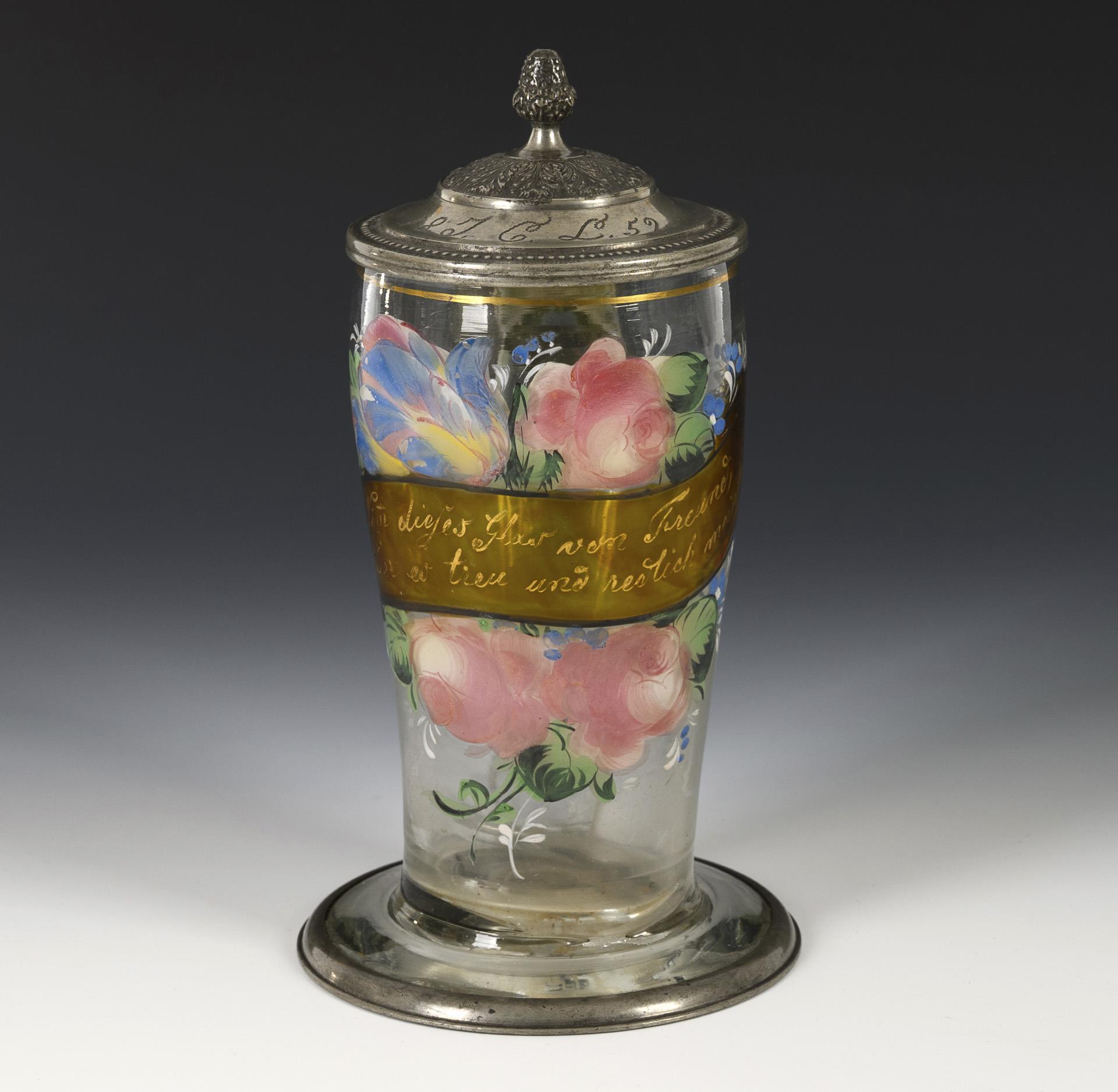 Slightly baluster-shaped jug with wide, pewter-mounted base, strap handle and pewter-mounted hinged lid; pontil mark. On the front a bouquet of flowers with a yellow inscription band, on it the inscription "Take this glass from a friend; Who means it faithfully and honestly.", on the pewter lid the engraving "18. J. C. L. 52.". Gold somewhat rubbed.