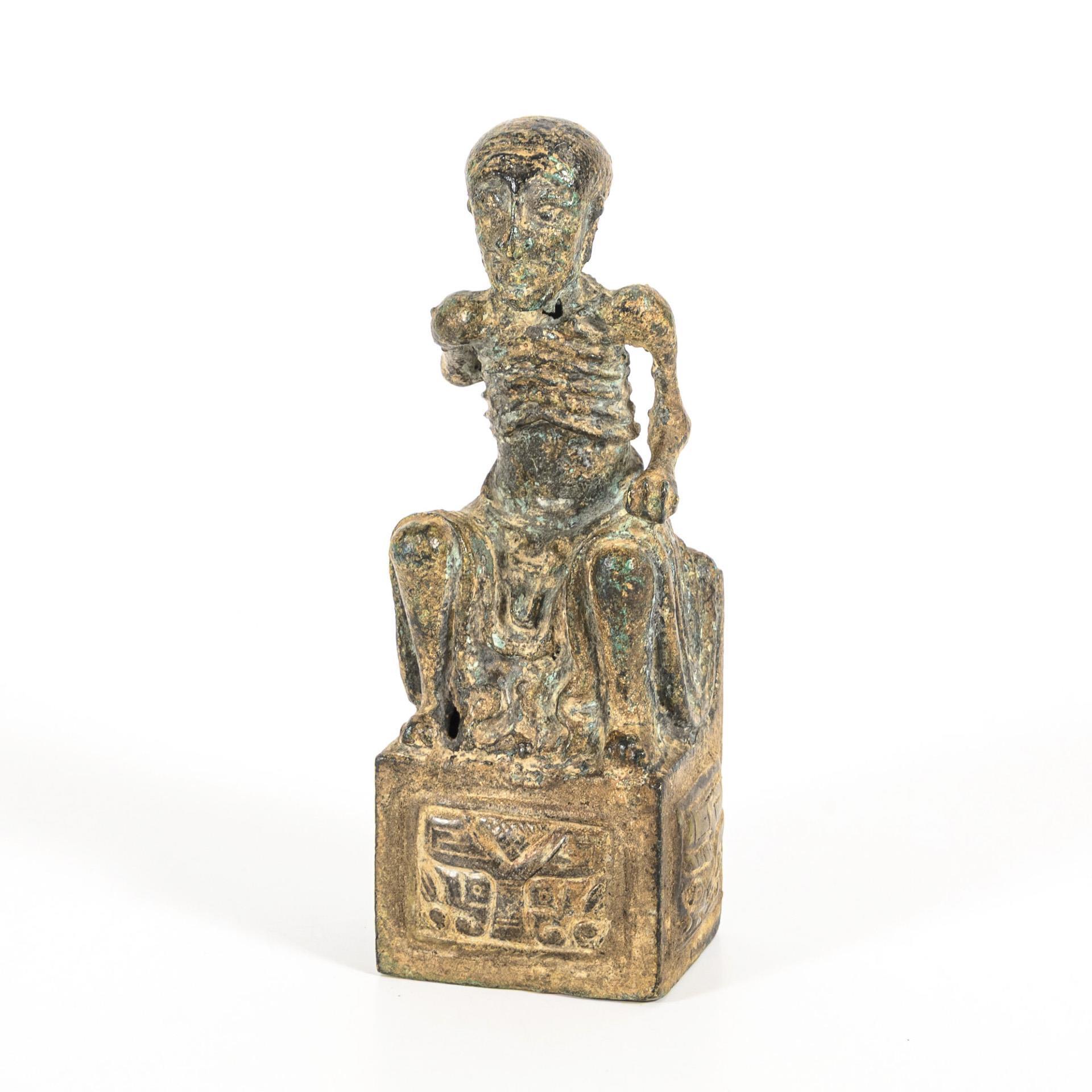 Sitting, emaciated yogi with one arm held behind his back. On a rectangular base with inset relief panels. Patinated surface.
