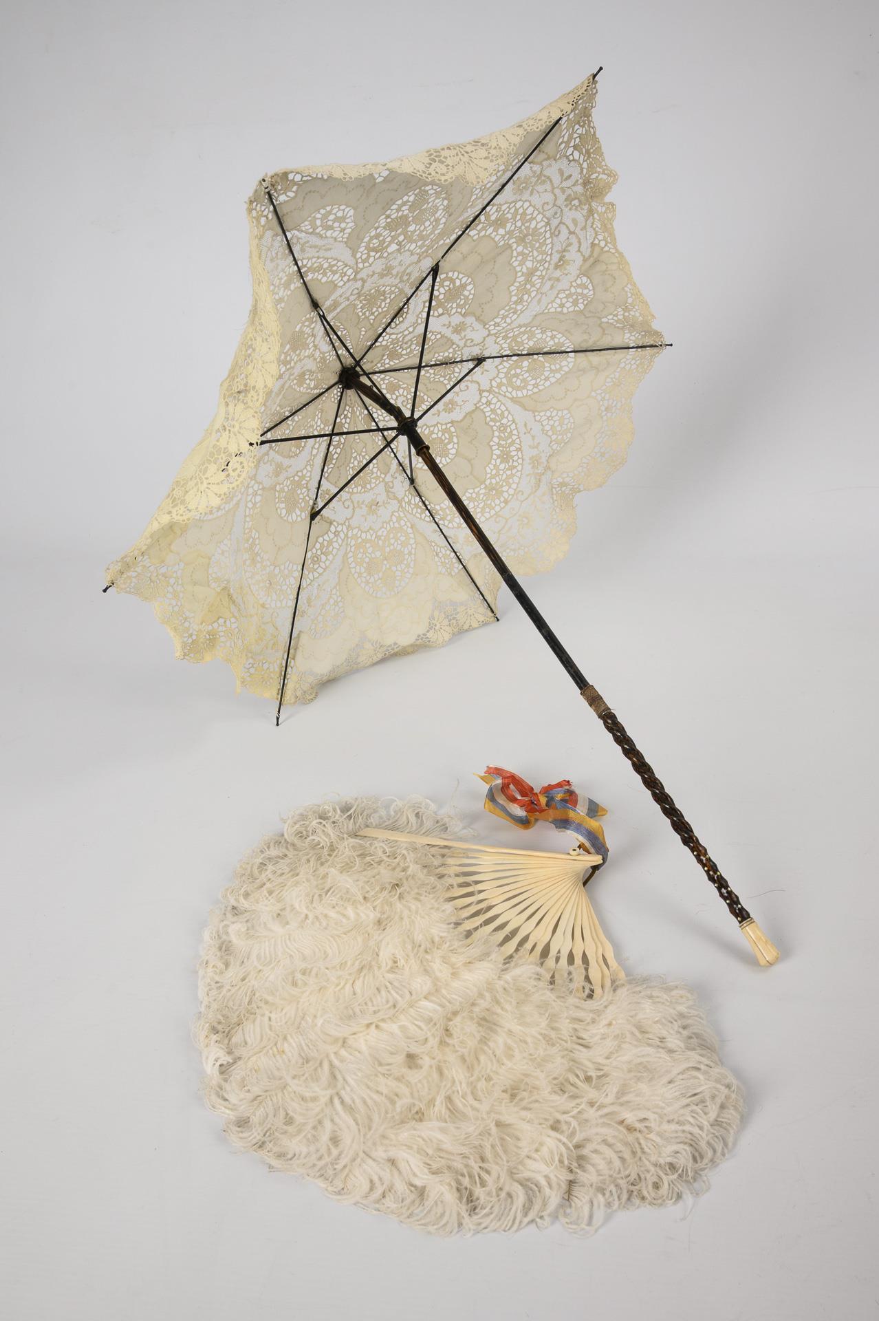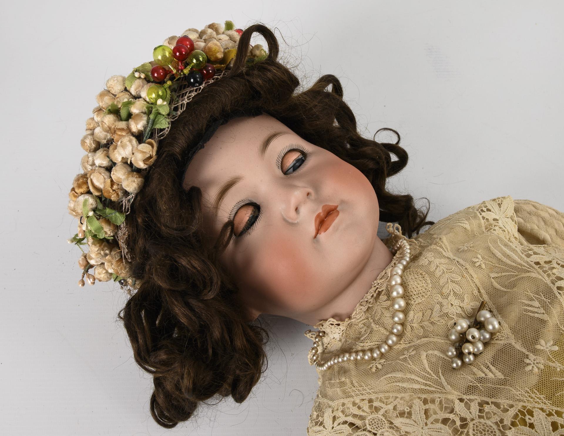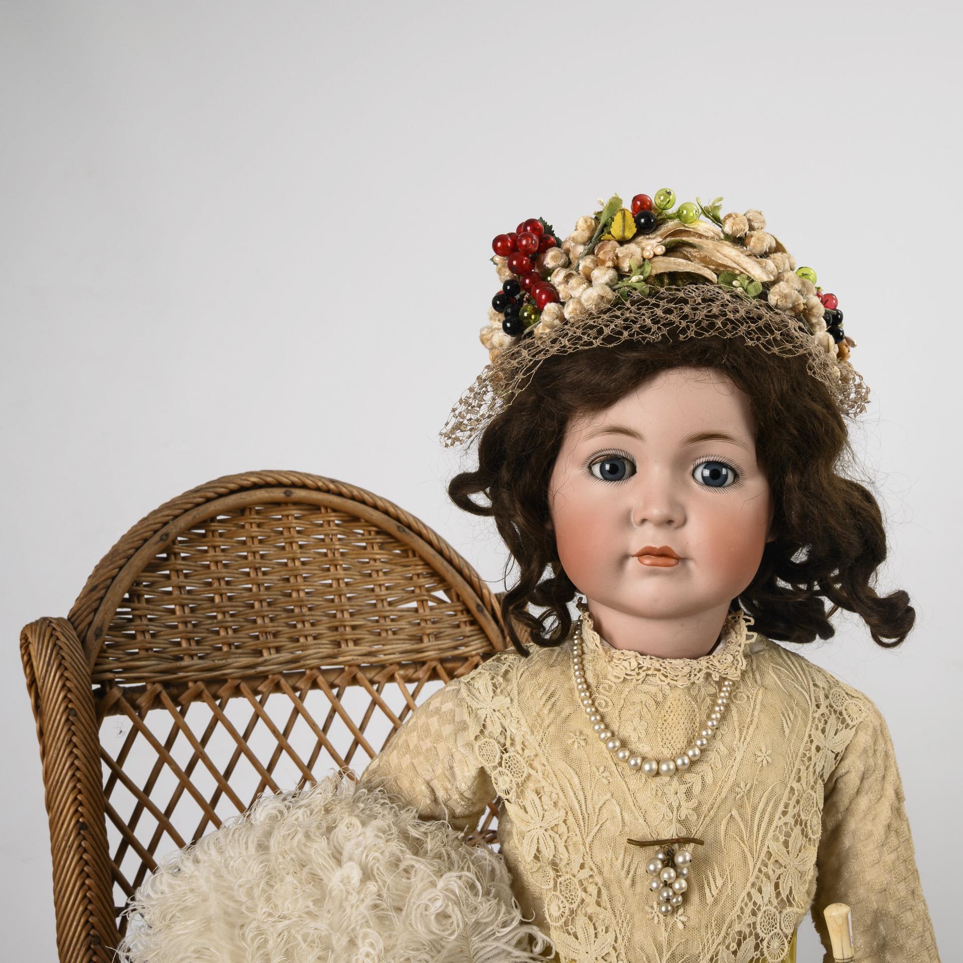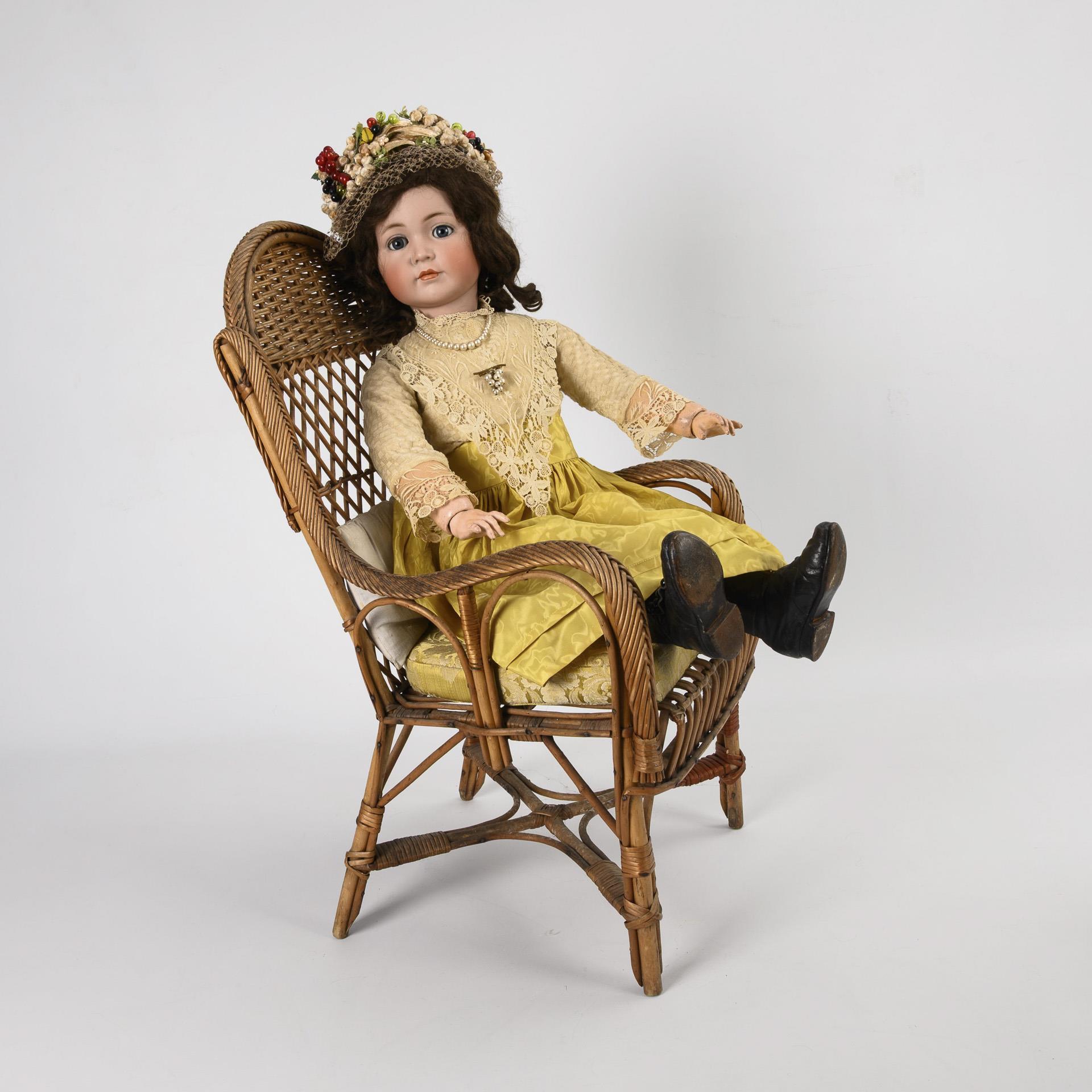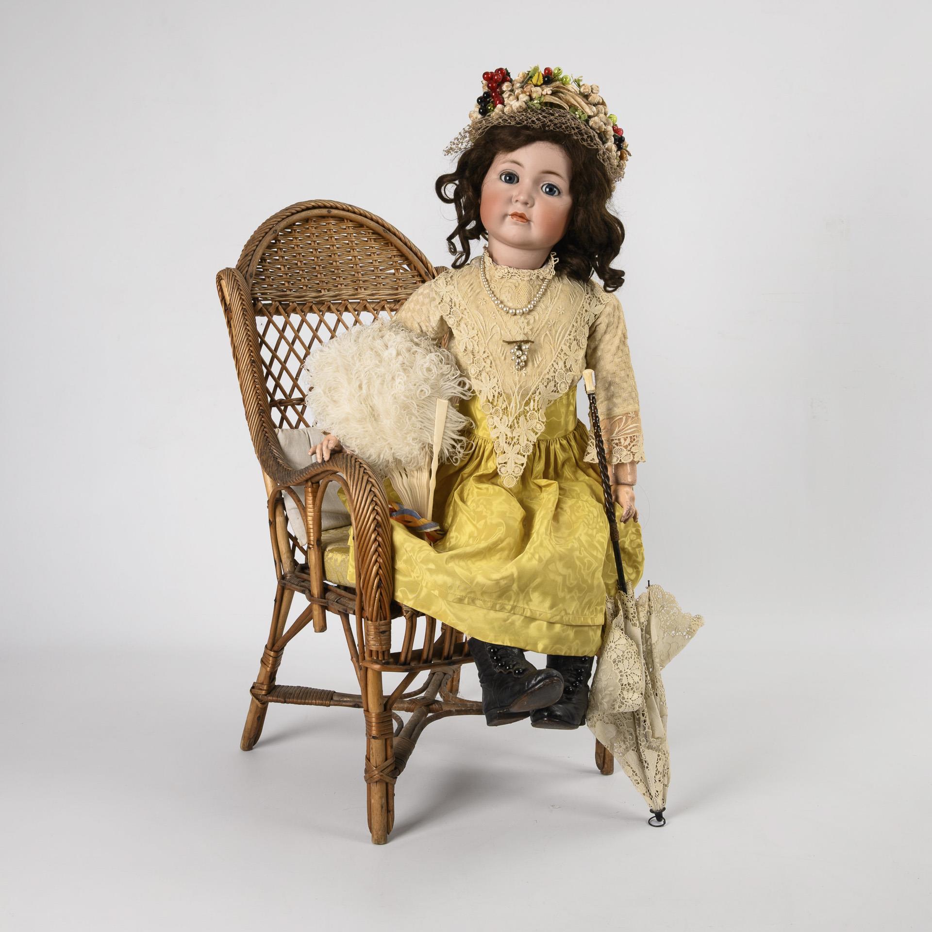 Cranked head, blue sleeping eyes, brown mohair wig with curls, 17-piece jointed body, yellow dress with lace collar, richly decorated hat, old leather boots. L 72 cm. With a feather fan, parasol and rattan armchair (69 x 37 x 44 cm). Head x-rayed: no cracks, only a short burn mark to the crown of the head.