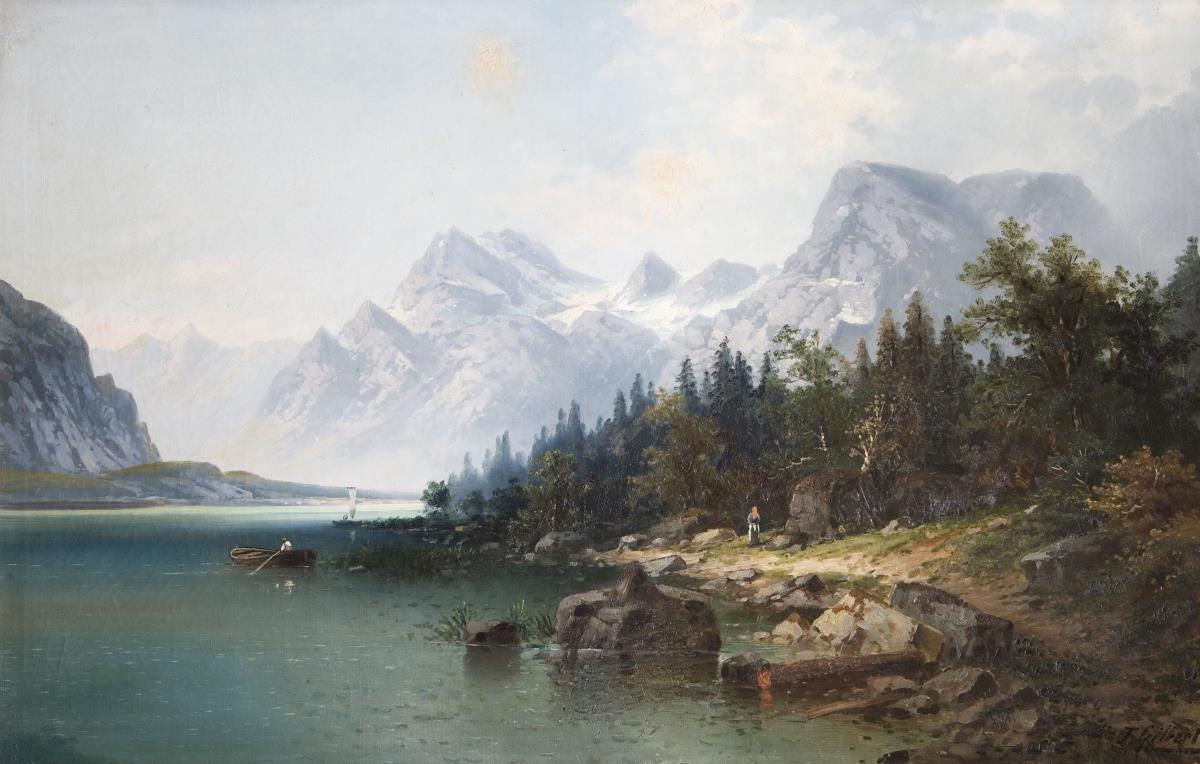 Romantische Ansicht vom Achensee in Tirol (Österreich). Originaler Keilrahmen, schmaler Goldrahmen. Rahmen an den Ecken verstärkt .