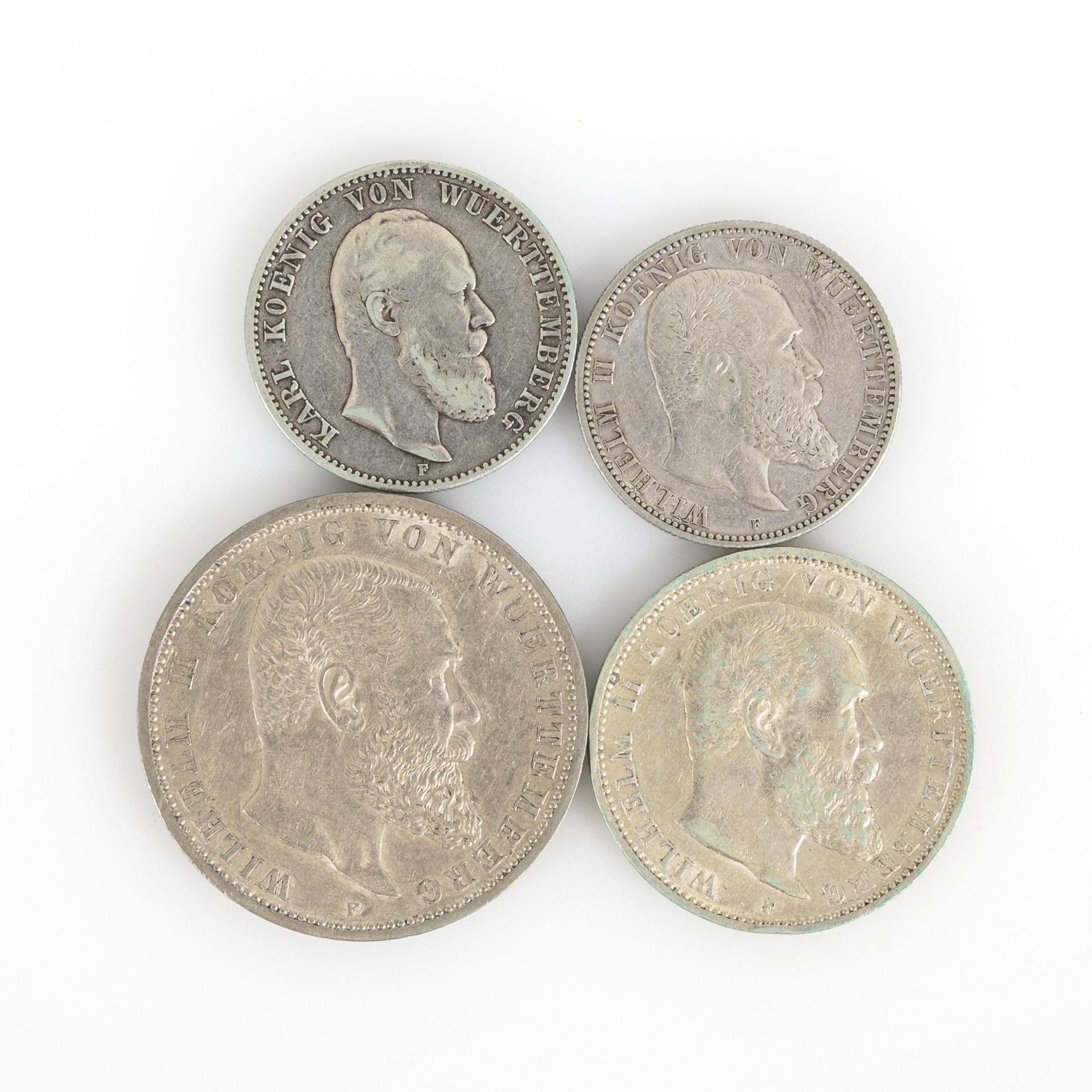 5 marks, 1908, "Wilhelm II. Koenig von Württemberg" / as before 3 marks, 1909 / as before, 2 marks 1904 / 2 marks, 1876, "Karl Koenig von Württemberg". All mint F. Condition: very nice +.