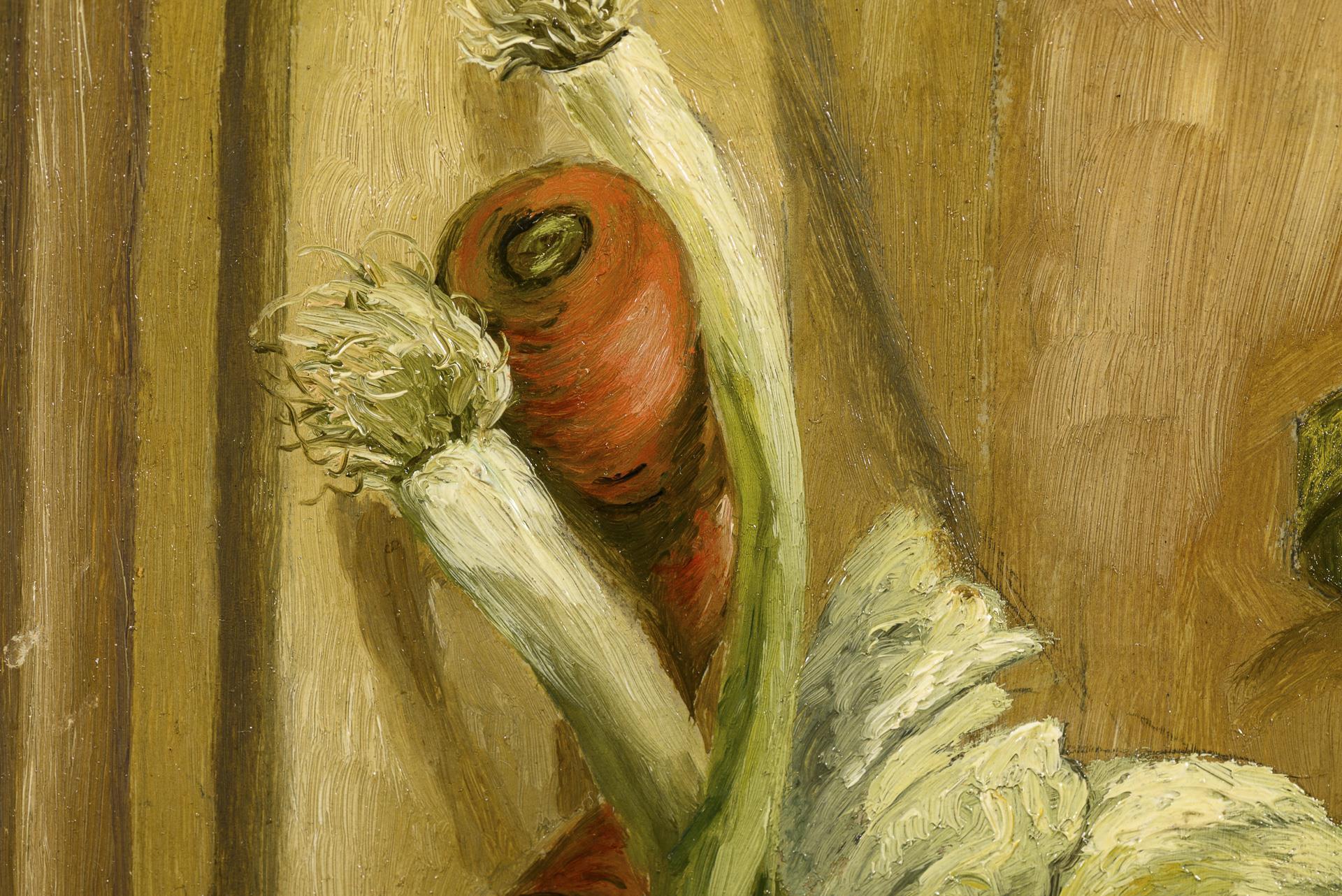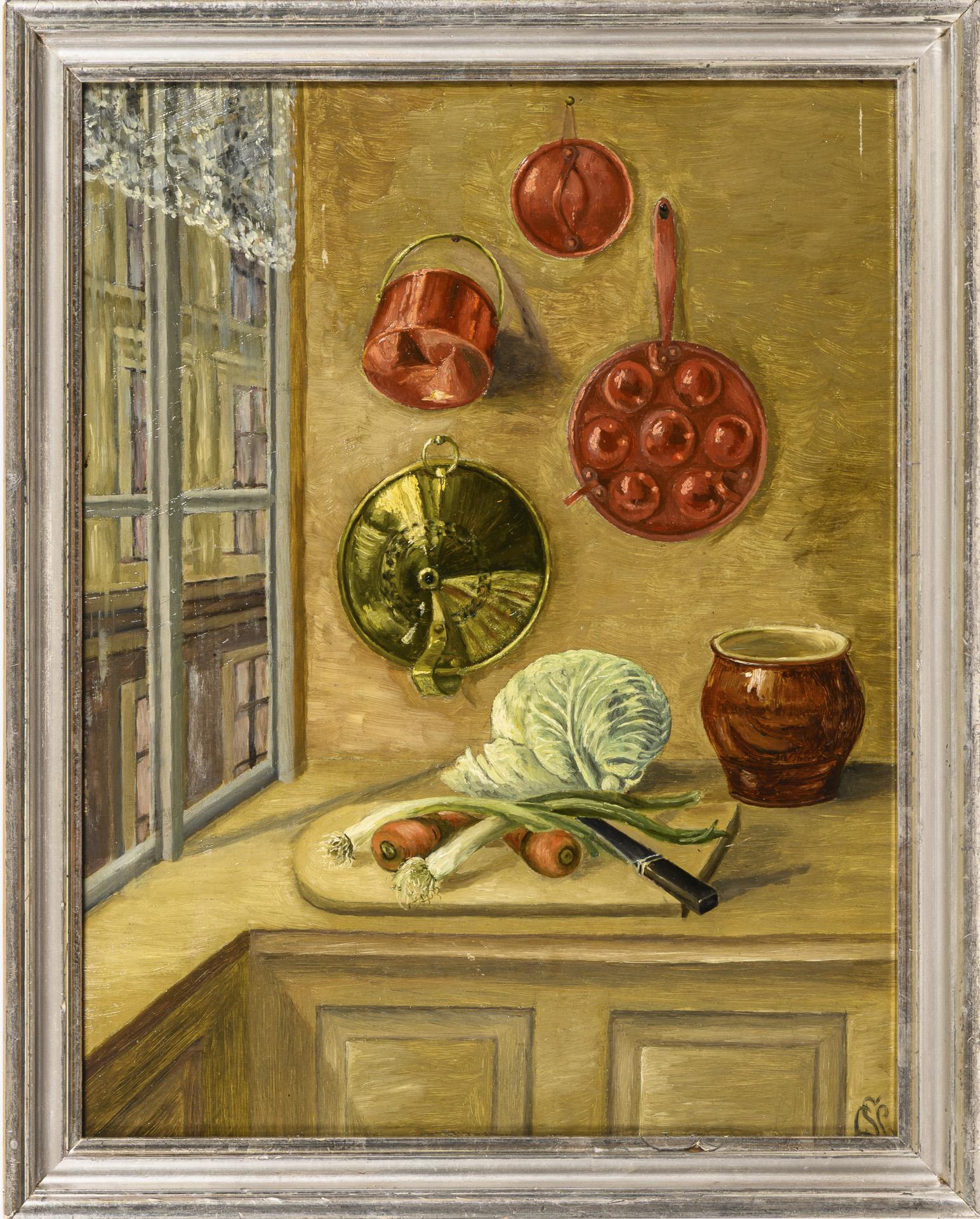 Leeks, cabbage and carrots on the work surface in front of the wall with the kitchen vessels.