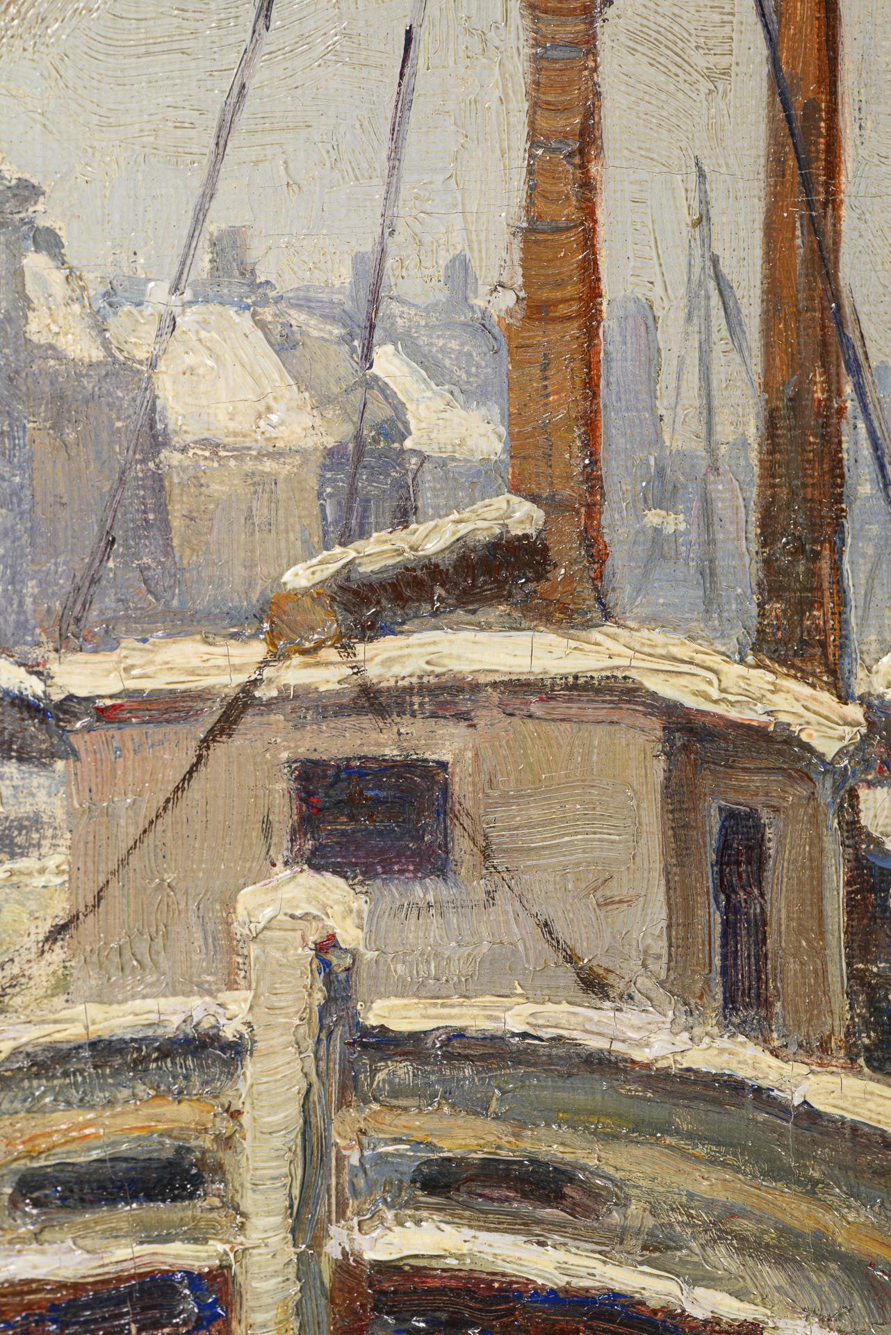 Ships on a snow-covered quay under a gray sky.